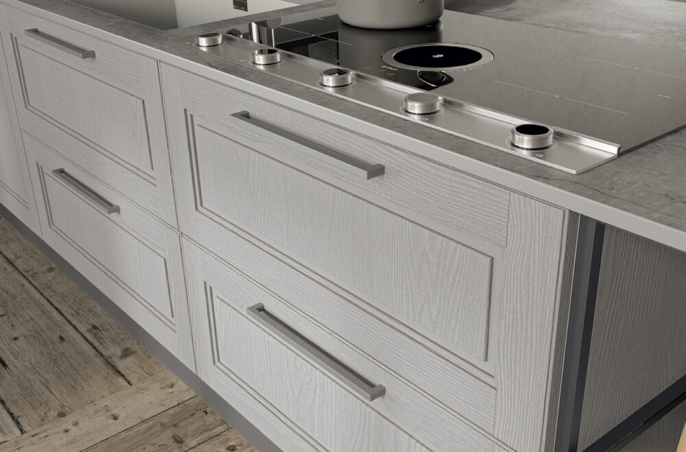Anta sp.24 mm costituita da un telaio in massello di frassino e bugna in MDF impiallacciata. Laccatura spazzolata con finitura opaca e grado di lucentezza 2 GLOSS.