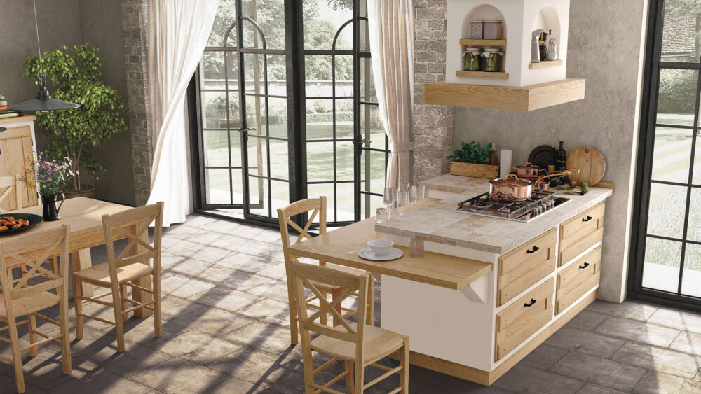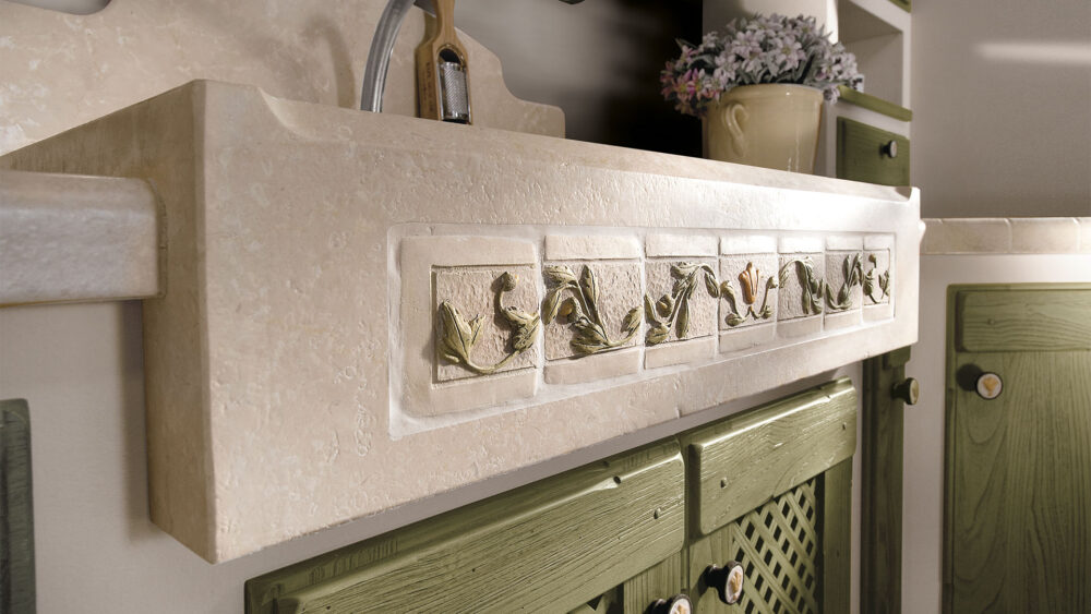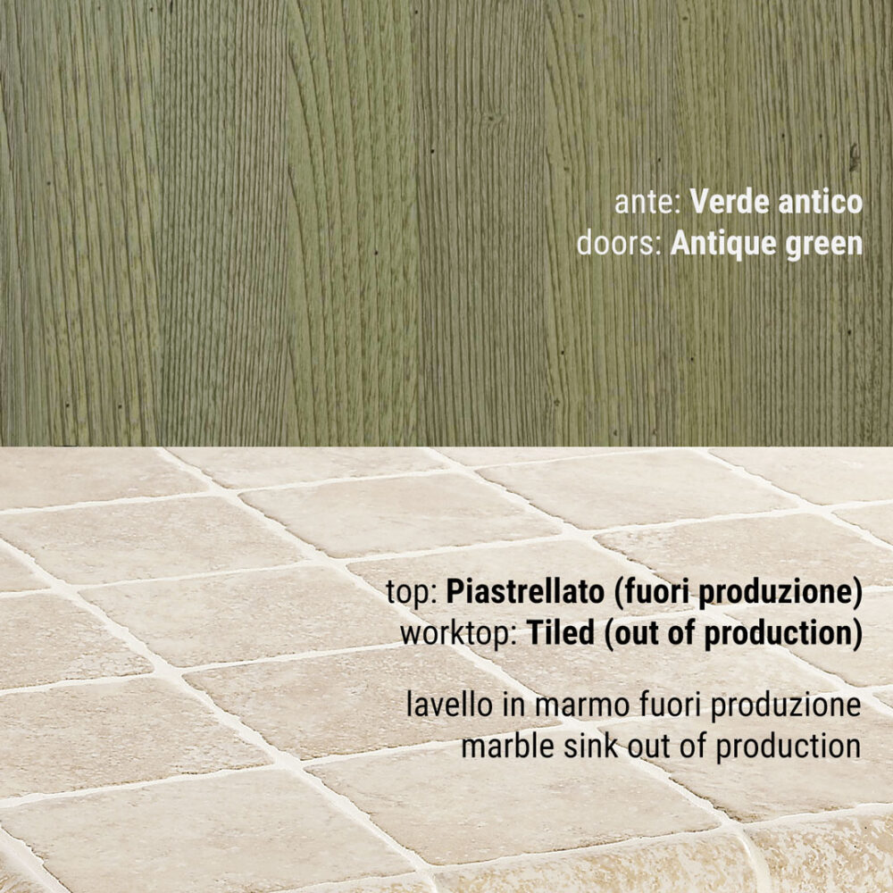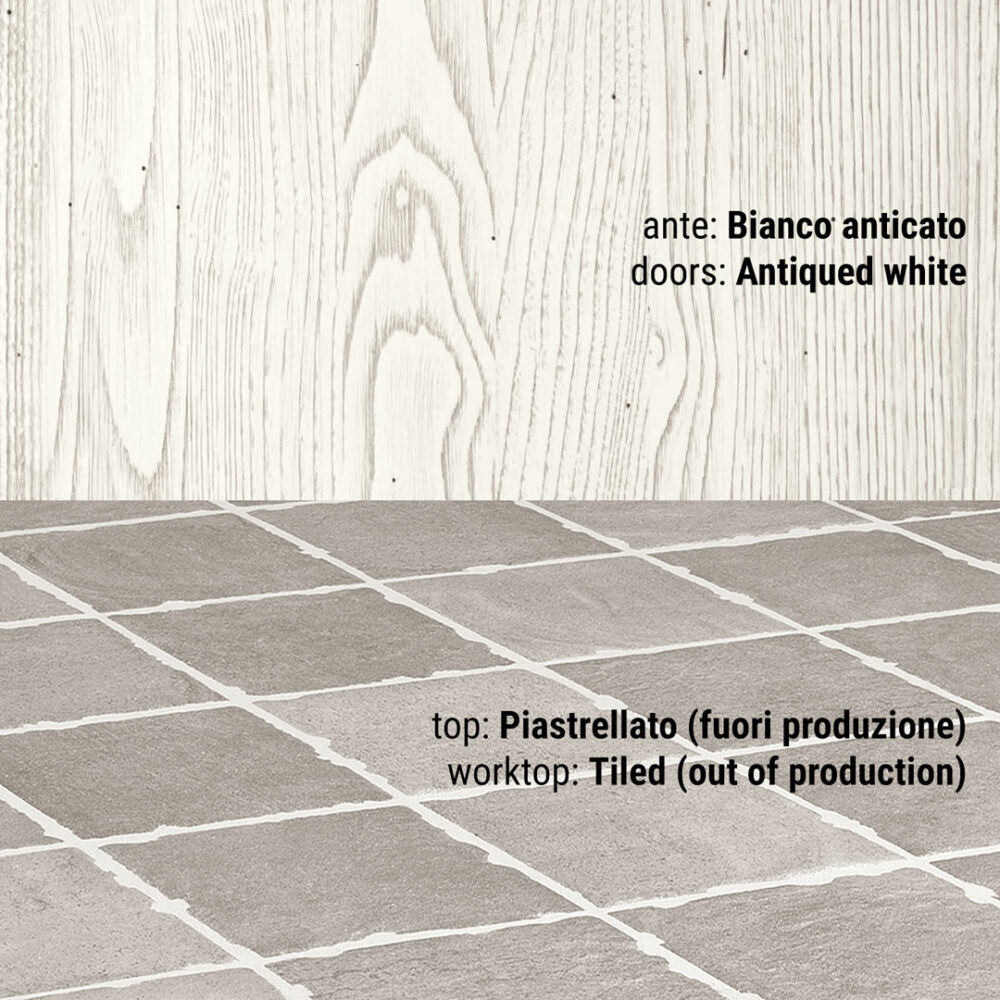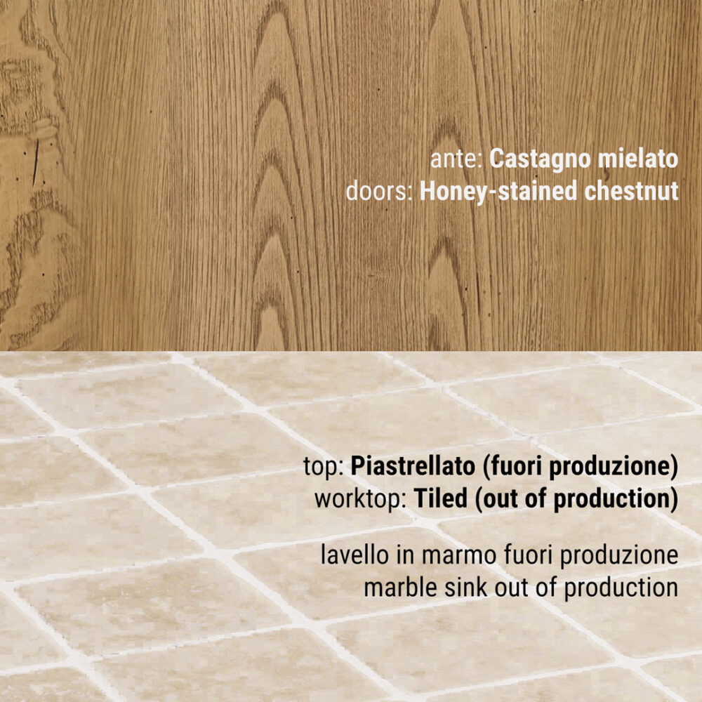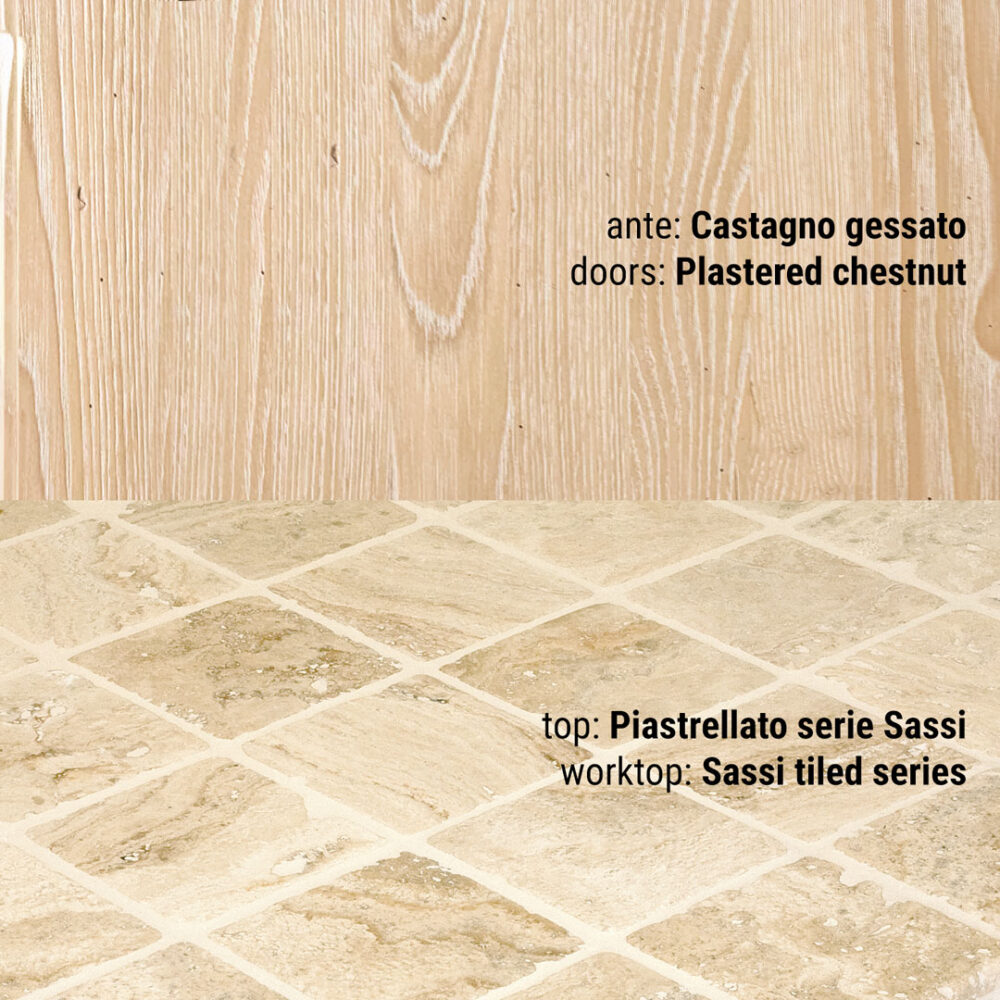 Piano piastrellato: pannello di compensato in legno di abete conforme allo standard E1 (a bassa emissione di formaldeide) sp 30 mm decorato con ceramica o pietra naturale sp 10mm. La posa del decorativo viene effettuata con l’utilizzo di silicone polimerico trasparente. La sigillatura della fughe è eseguita con un prodotto epossidico bi-componente impermeabile, batteriostatico, funghi statico, resistente all’abrasione, agli acidi e antimacchia. Il tutto viene trattato con un protettivo antimacchia per pietra e gres porcellanato. Per i piani di lavoro in altri materiali vedi notizie utili.