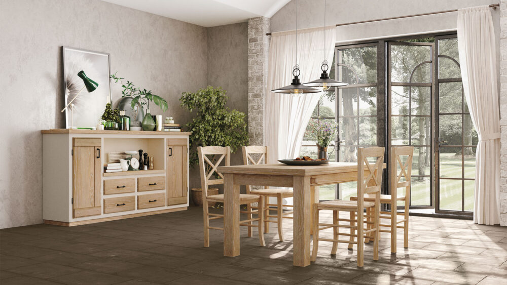 Struttura: in legno massello verniciato con prodotti all’acqua (impregnante) e acrilici/poliuretanici (fondo). Seduta e Schienale: in legno massello oppure in simil paglia.