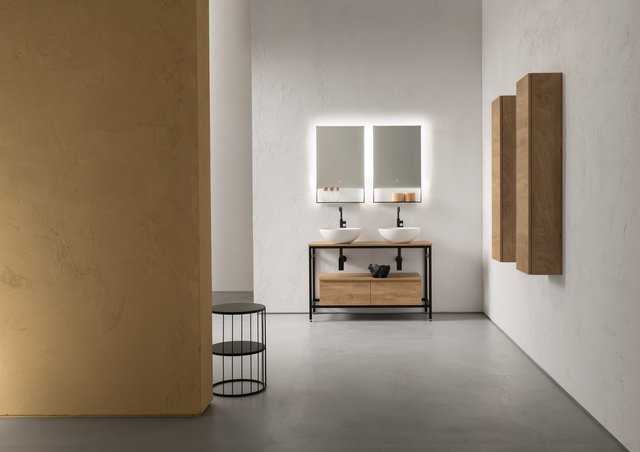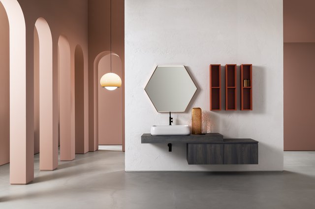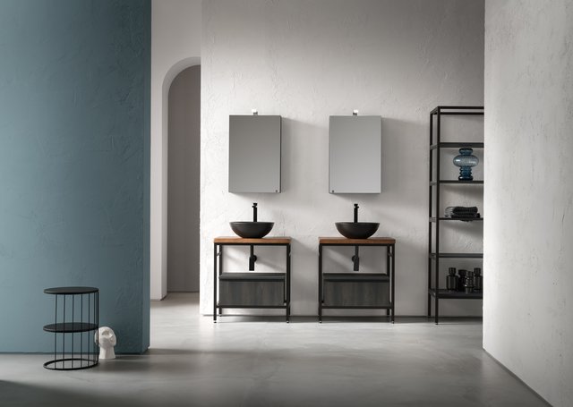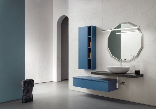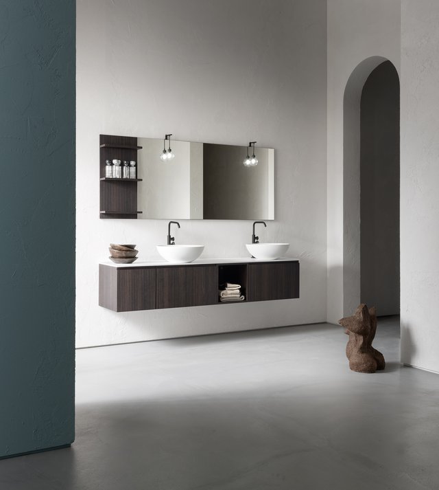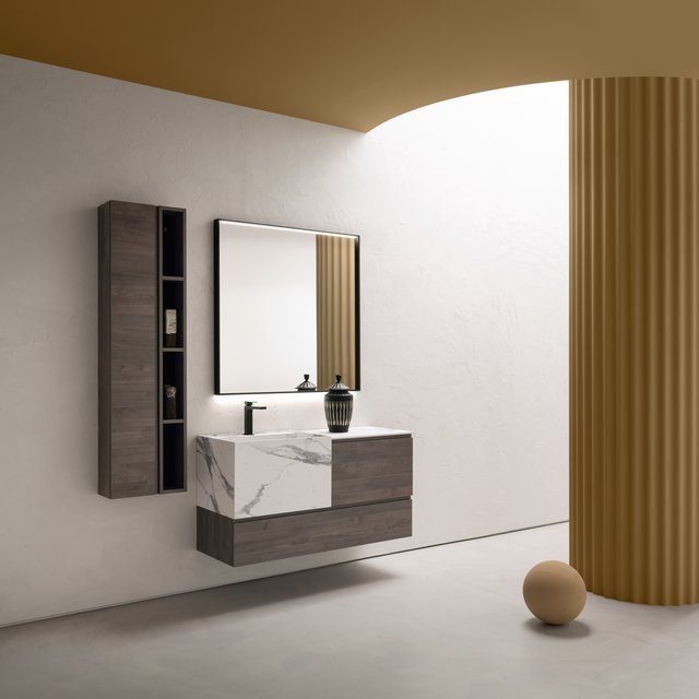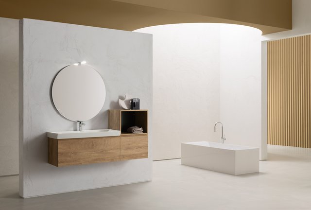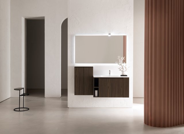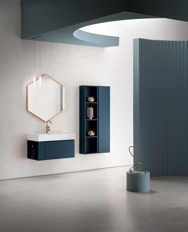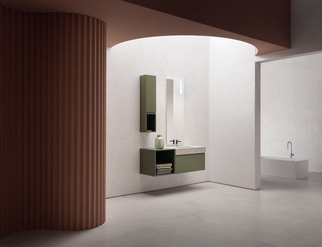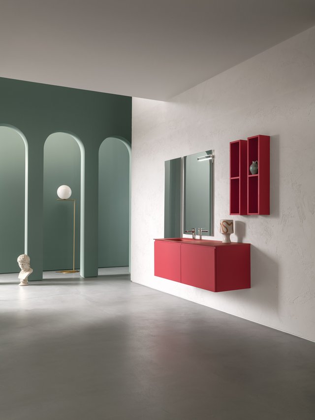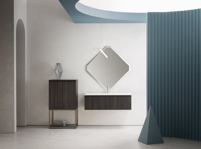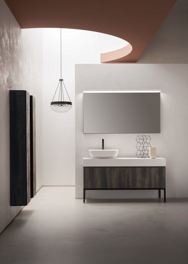 Il vero senso delle cose va oltre il tempo e la razionalità. – L’essenza delle cose si raggiunge solo osservandole fuori dal loro contesto, svincolate da ogni tipo di legame – che sia spaziale o temporale –, trasportandole in uno spazio senza tempo. Qui e ora predomina il silenzio assoluto e una sensazione di tempo sospeso, che è il tempo in cui ritroviamo il vero senso delle cose, il senso di noi stessi. Entrare in quello spazio è come entrare dentro uno specchio, che è anche metafora di un mondo misterioso, parallelo, magico, di un mondo dove domina la creatività. I mobili da bagno della collezione B-go vanno oltre il tempo e la razionalità grazie alle forme essenziali che hanno. La presa dell’anta è quasi nascosta ma ben funzionale, dato dall’incavo a gola.