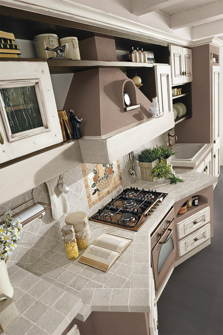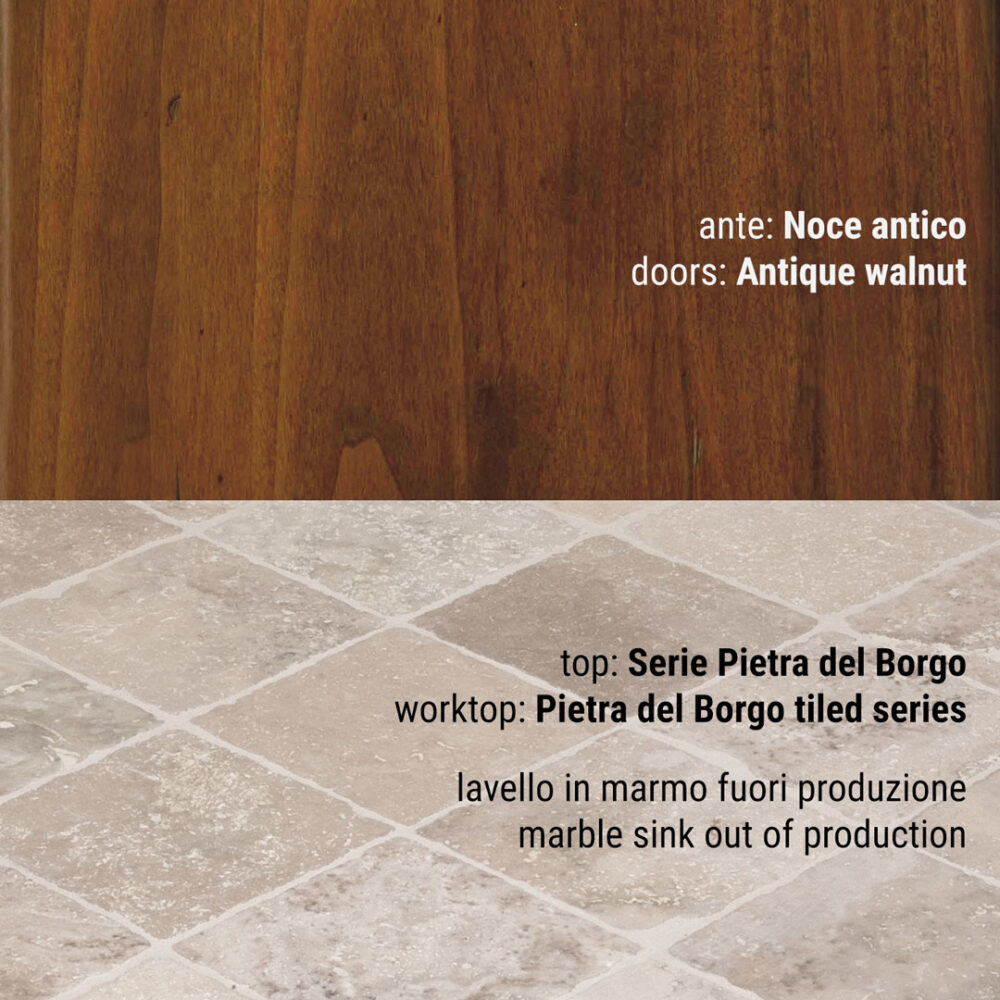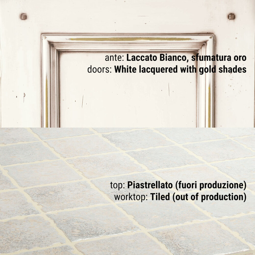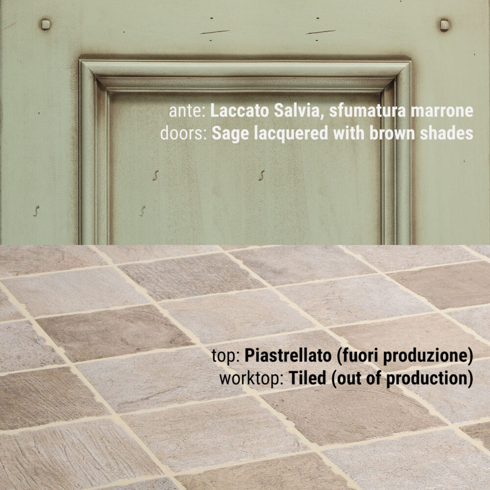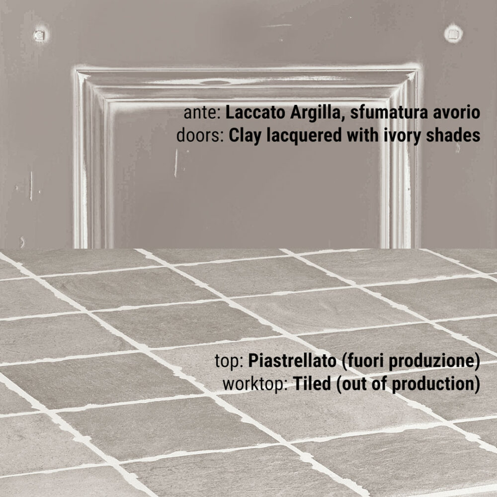 Piano piastrellato: pannello di compensato in legno di abete conforme allo standard E1 (a bassa emissione di formaldeide) sp 30 mm decorato con ceramica o pietra naturale sp 10mm. La posa del decorativo viene effettuata con l’utilizzo di silicone polimerico trasparente. La sigillatura della fughe è eseguita con un prodotto epossidico bi-componente impermeabile, batteriostatico, funghi statico, resistente all’abrasione, agli acidi e antimacchia. Il tutto viene trattato con un protettivo antimacchia per pietra e gres porcellanato. Per i piani di lavoro in altri materiali vedi notizie utili.