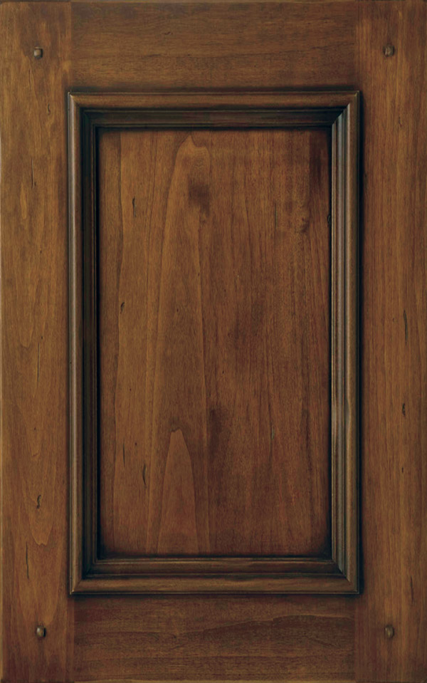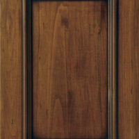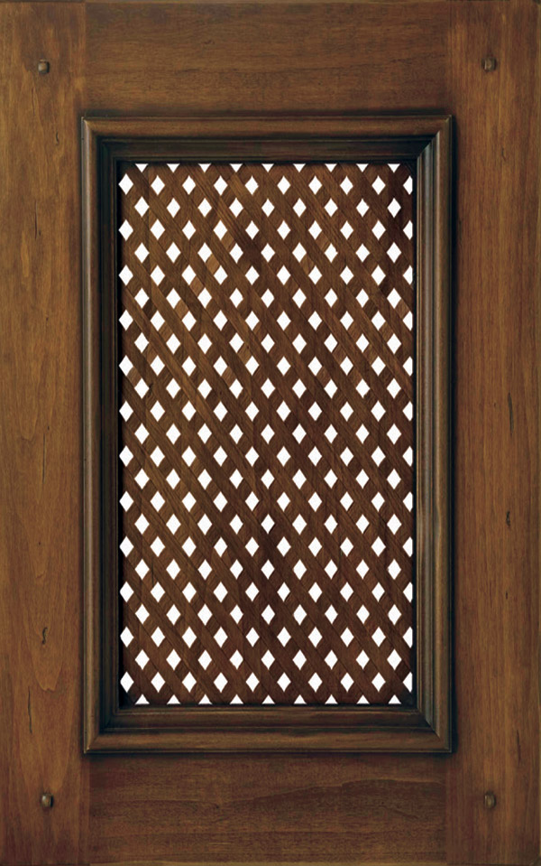 Telaio con bugna o grata in legno massello di frassino sp. 24 mm. La verniciatura è eseguita con ciclo misto all’acqua e al solvente con tinta anticata a straccio e finitura trasparente effetto Noce; grado di brillantezza semiopaco (20 gloss).