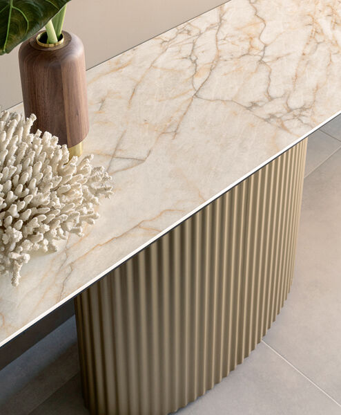 Consolle fissa con base in metallo con effetto cannettato. Piano in ceramica stratificata su vetro bisellato dello spessore di 12 mm. Numerose le finiture tra cui scegliere.