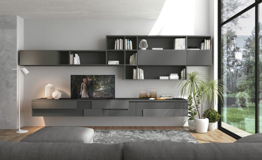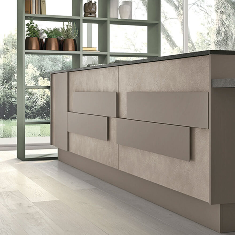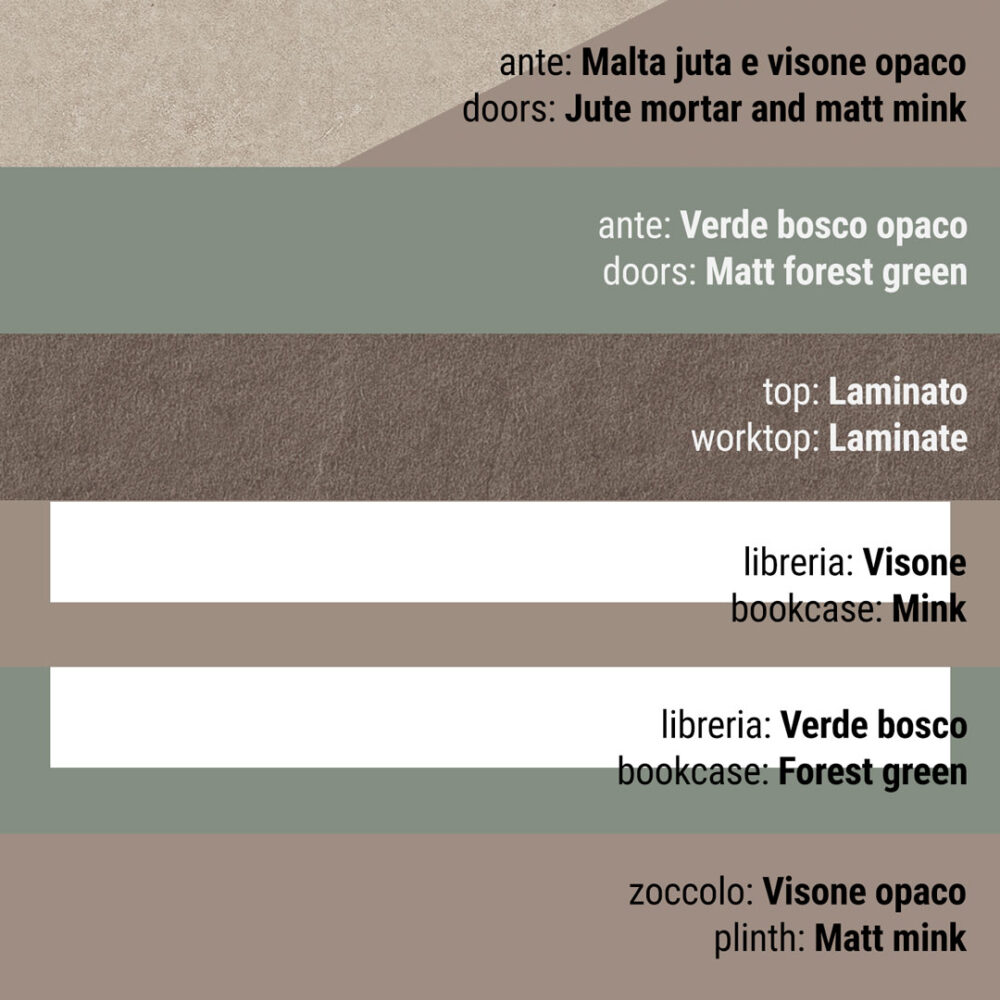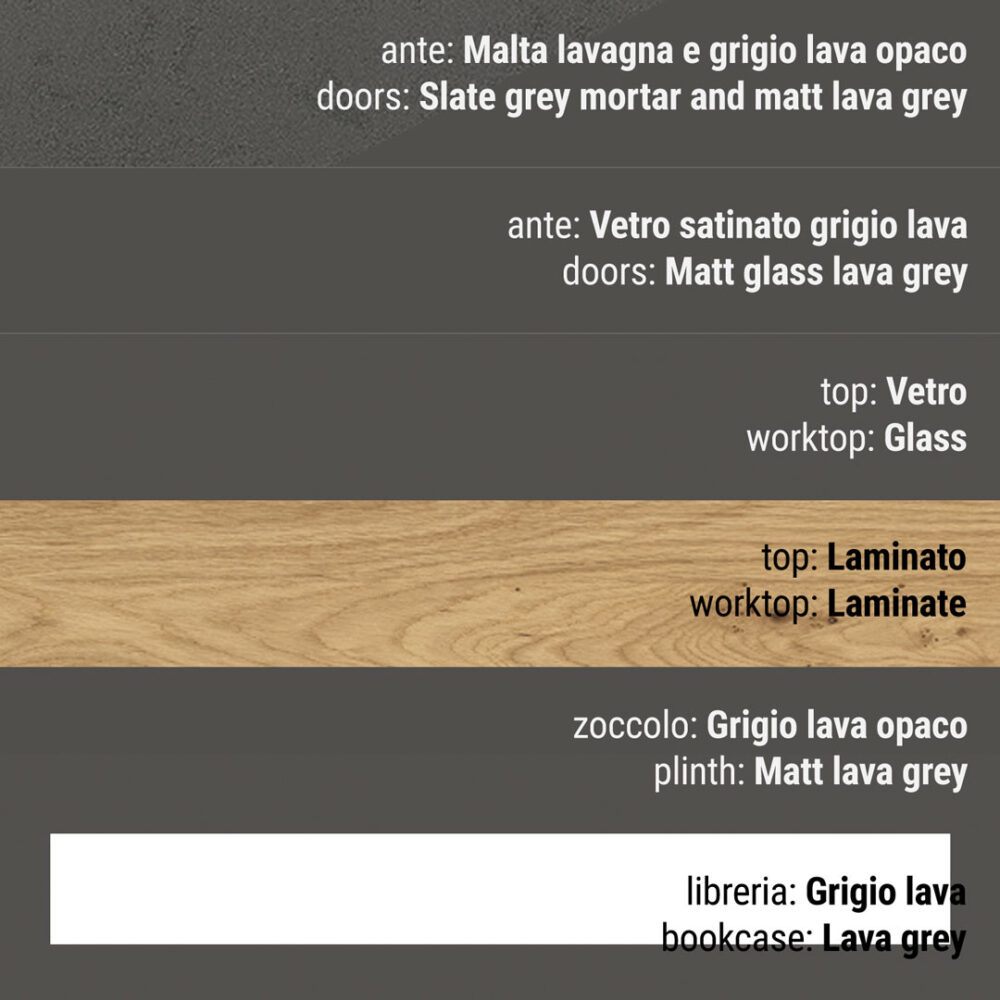 Anta posteriore costituita da un supporto di pannello di particelle di legno (classe E1) spessore 16 mm, nobilitato melaminico 2 lati e bordato 4 lati con bordo ABS 1 mm in tinta con l’anta, incollato con colle poliuretaniche; disponibili effetto malta nelle tinte lavagna, juta, grigio nebbia o rovere nodato a registro nelle tonalità cashmere, white e brown. Anta a rilievo costituita da un supporto di pannello di fibre a media densità (classe E1) spessore 16 mm, nobilitato laccato con fondo bianco a base di resina poliestere e verniciatura con vernice poliuretanica catalizzata con isociano non ingiallente (finiture laccate esenti da cromo, piombo e cadmio). Sono disponibili in diversi colori lucidi diretti e opachi “soft” anche a campione. L’assemblaggio delle due ante viene fatta utilizzando colla termofusibile poliuretanica.