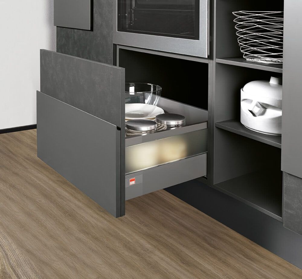 La struttura può essere costituita da un fondo di particelle di legno (bassissima emissione di formaldeide) di spessore 16 mm nobilitato in laminato grigio con sponde laterali e schiena in lamiera di acciaio zincata e verniciata anticorrosione, oppure la struttura può essere integralmente in massello di faggio e multistrato; lo scorrimento avviene su guide ad estrazione totale con sistema ad incastro per bloccaggio antisganciamento ed invito automatico di chiusura che agisce negli ultimi 4 cm. Inoltre di serie è fornito il sistema di rallentamento in chiusura (blu-motion).