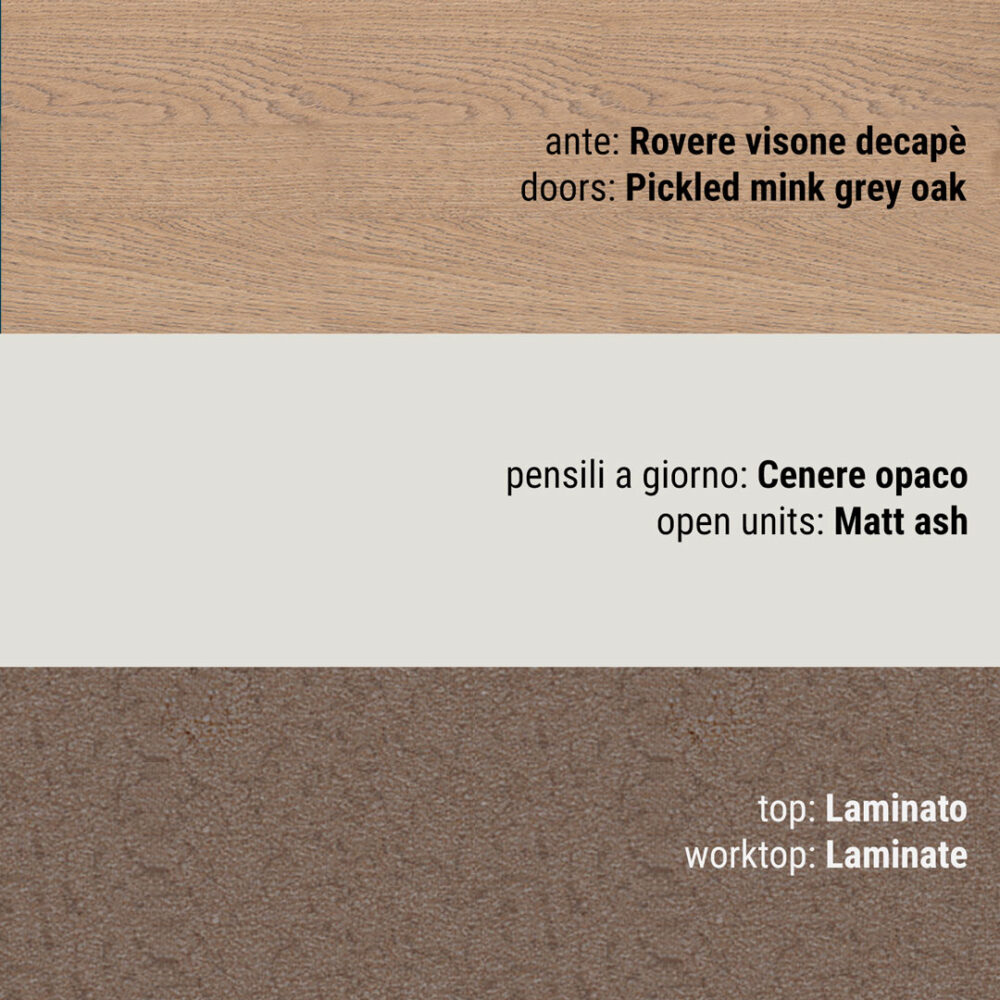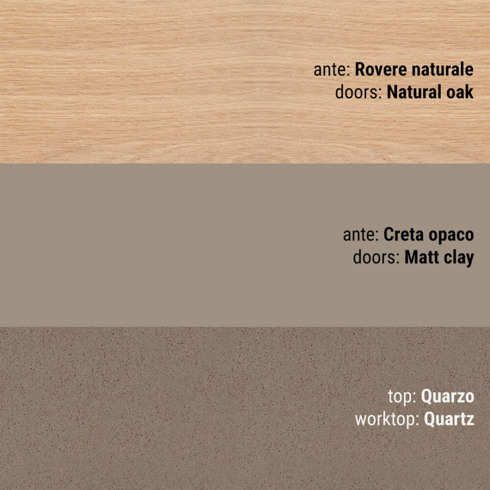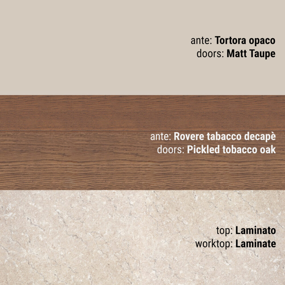 Per ante frassino bianco assoluto, frassino corda decapè grigio, rovere naturale, rovere tabacco decapè, rovere visone decapè, di serie: 560 finitura cromo passo mm 64/160/320 in funzione dell’anta; a richiesta: 272 finitura argento antico passo mm 128; 566 finitura cromo lucido con inserto satinato, passo mm 160; 561S finitura cromo profili esterni, interno satinato passo mm 64/160/320 in funzione dell’anta; 561B finitura cromo profili esterni, interno bianco passo mm 64/160/320 in funzione dell’anta; 561T finitura cromo profili esterni, interno tortora passo mm 64/160/320 in funzione dell’anta; 563S finitura cromo, interno satinato passo 64/160/320 in funzione dell’anta; 563B finitura cromo, interno bianco passo 64/160/320 in funzione dell’anta; 563T finitura cromo, interno tortora passo 64/160/320 in funzione dell’anta; 562S finitura satinata profili esterni, interno satinato passo 64/160/320 in funzione dell’anta; 562Bfinitura satinata profili esterni, interno bianco passo 64/160/320 in funzione dell’anta; 562T finitura satinata profili esterni, interno tortora passo mm 64/160/320 in funzione dell’anta; 562V finitura satinata profili esterni interno visone passo mm 64/160/320 in funzione dell’anta; 562G finitura satinata profili esterni, interno grafite passo mm 64/160/320 in funzione dell’anta; 488 finitura cromo passo mm64/160/320 in funzione dell’anta; 477 finitura cromo passo mm 64/160/320 in funzione dell’anta; 475C finitura cromo passo mm 96/160/320 in funzione dell’anta; 475M finitura brown opaco passo mm 96/160/320 in funzione dell’anta; 479C finitura cromo passo mm 96/160/320 in funzione dell’anta; 479B finitura bianco opaco passo mm 96/160/320 in funzione dell’anta; 479M finitura brown opaco passo mm 96/160/320 in funzione dell’anta; 790C finitura cromo passo in funzione dell’anta; 790M finitura brown passo in funzione dell’anta; L maniglia in legno.
