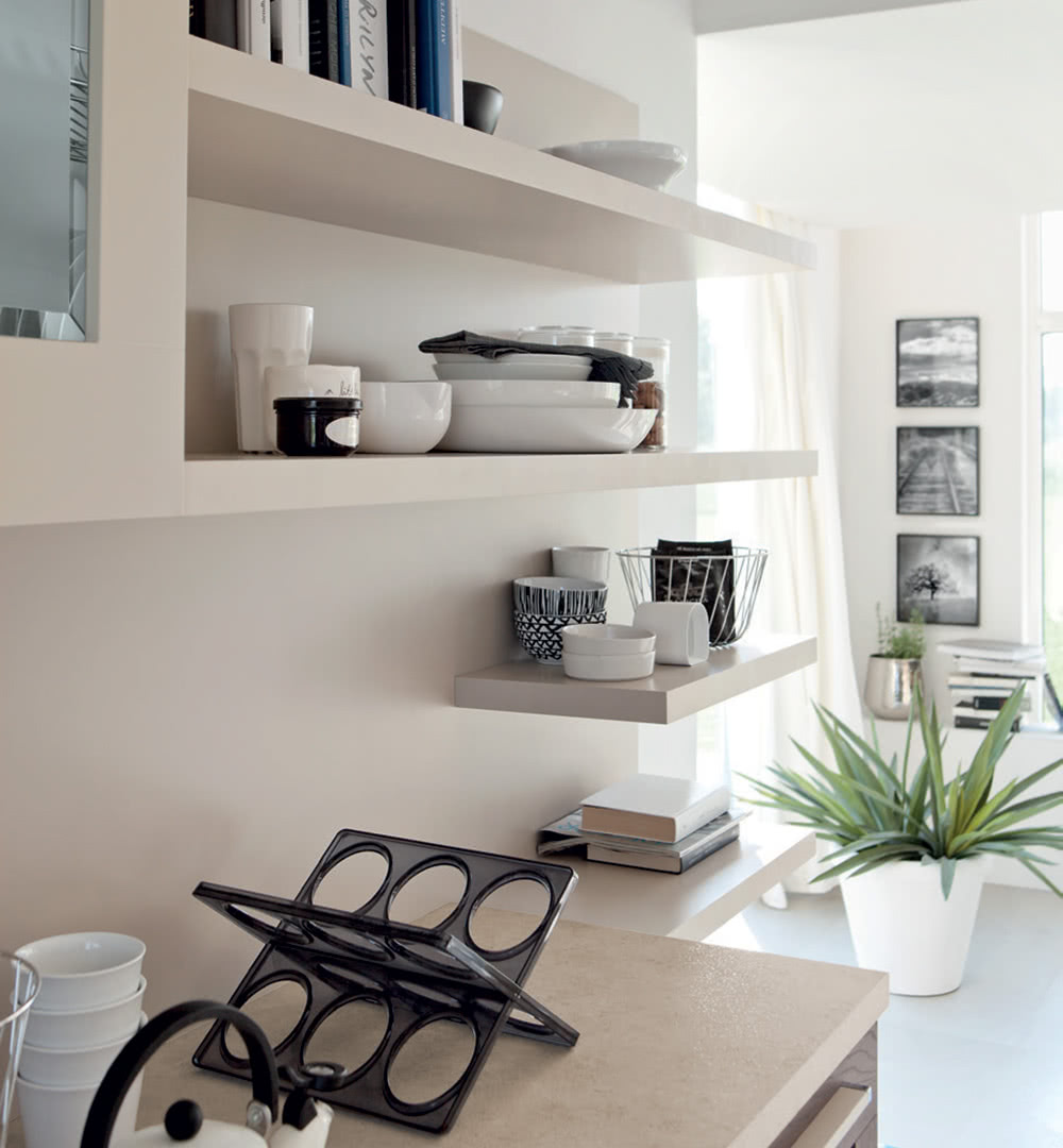 Costituiti da pannelli di fibre ad alta densità di spessore 2,8 mm conformi E1 e US EPA TSCA Title VI per l’emissione di formaldeide nobilitati in polipropilene per i pensili e verniciati per basi e colonne.