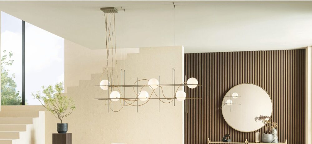 Le sottili linee metalliche delle lampade di design Iron creano armonici incastri, disegnando una struttura che sembra sfidare la gravità.