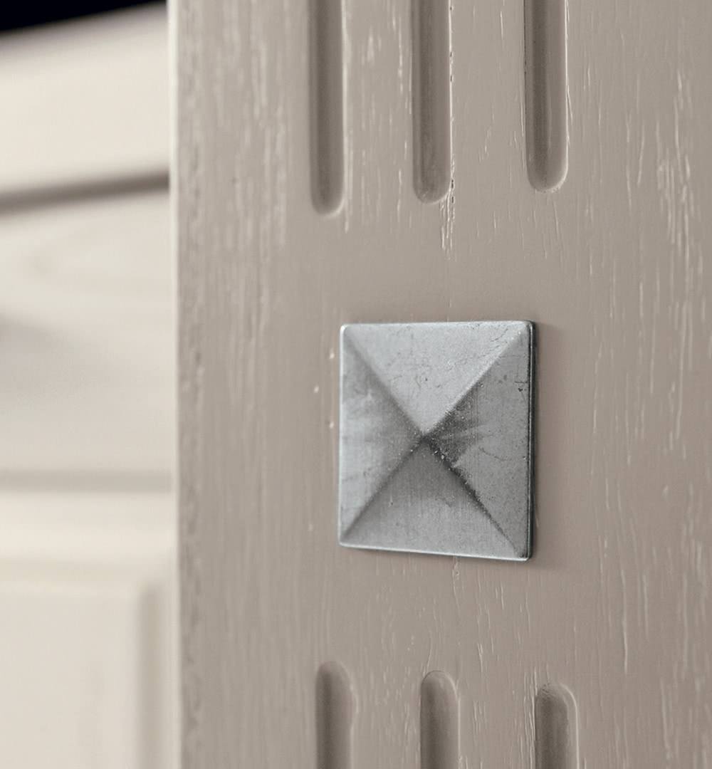 In lega di zama con bagno galvanico finitura argento anticato (opz 160; opz 435; opz 606); finitura ottone (opz 182; opz 147; opz 430;); finitura ottone con inserto in zama color avorio (opz 651); oppure finitura ottone con formelle in ceramica dipinte a mano (opz 611) .