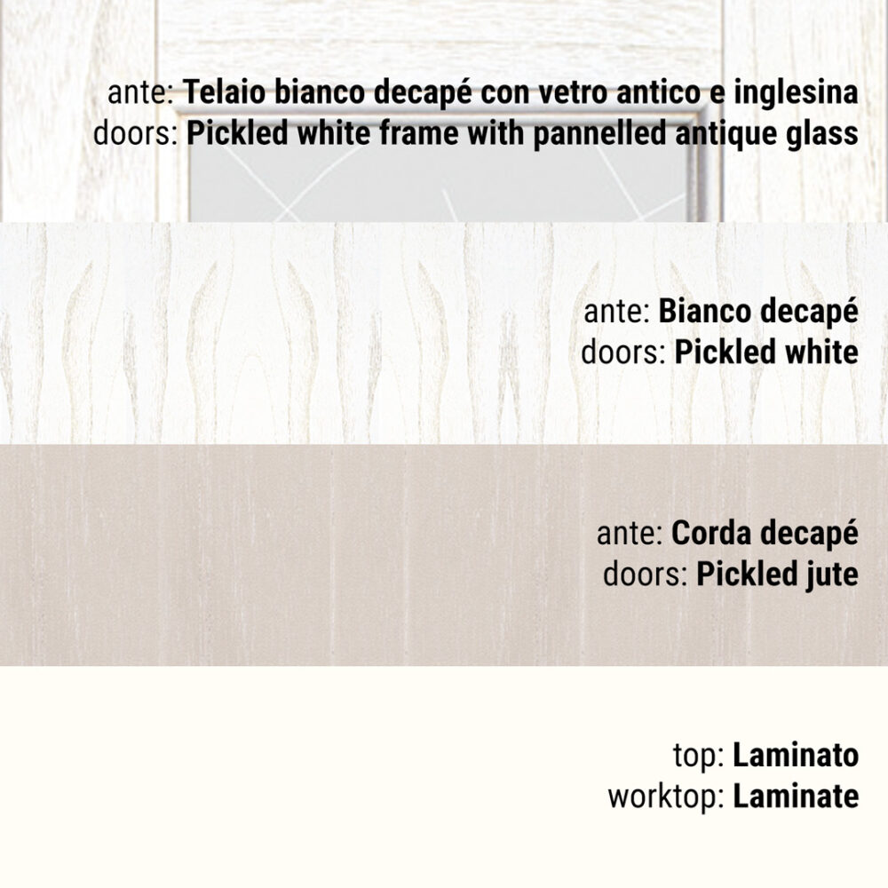 In legno di abete o MDF (classe E1) impiallacciato con tranciato di legno (diverso a seconda del modello); verniciatura acrilica/poliuretanica.