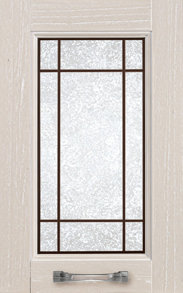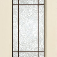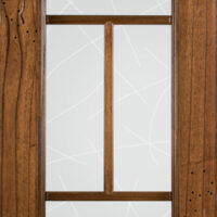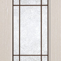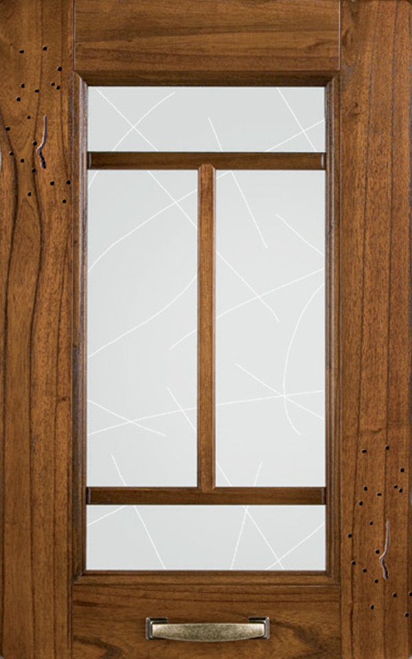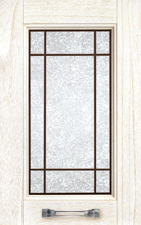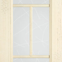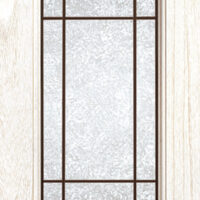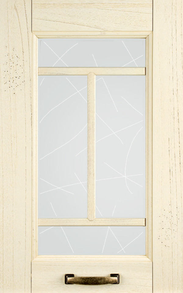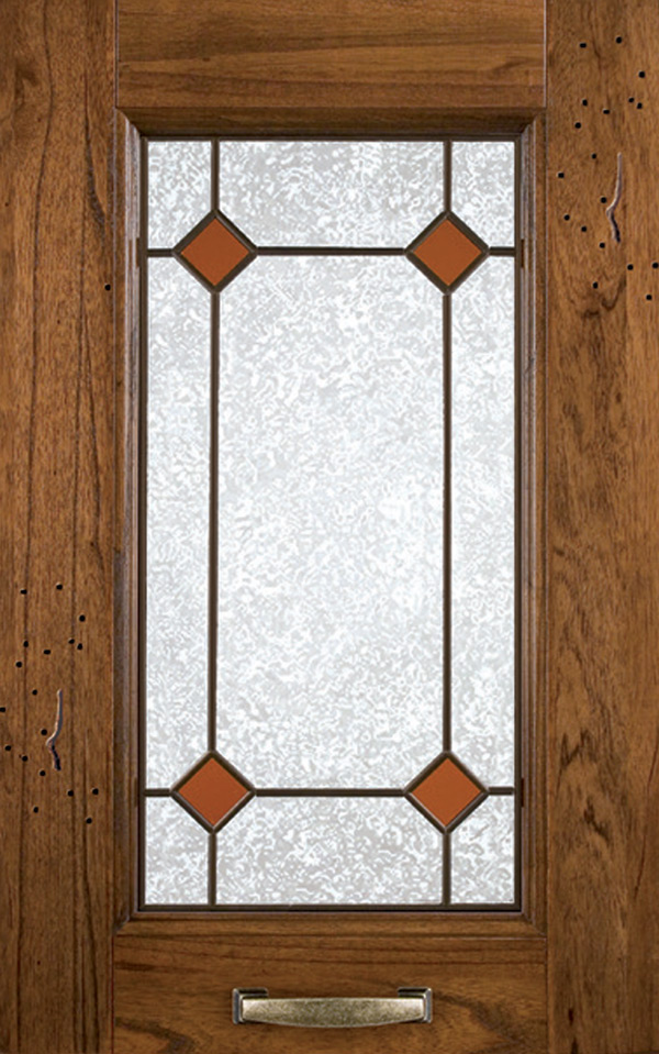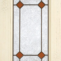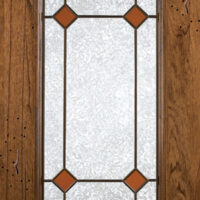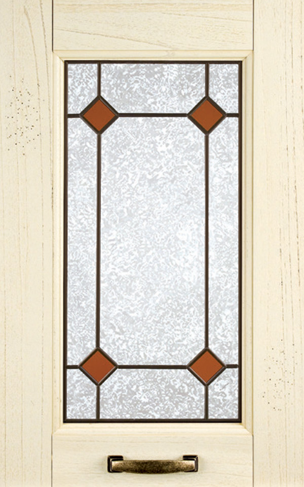 Telaio come ante piene con inglesina e vetro trasparente antico di spessore 4 mm temperato, oppure senza inglesina con vetro rilegato e serigrafato con rombi.