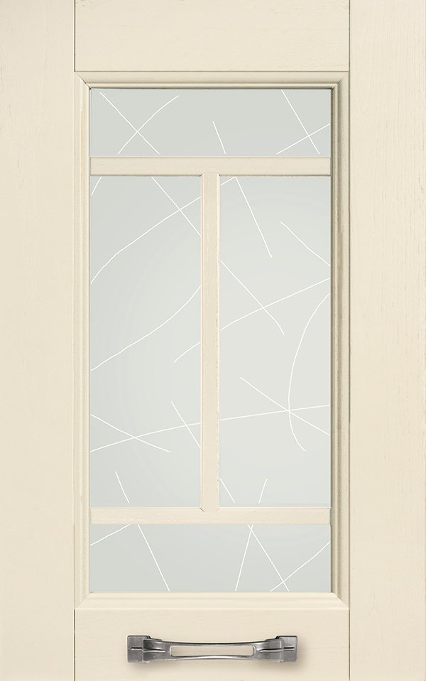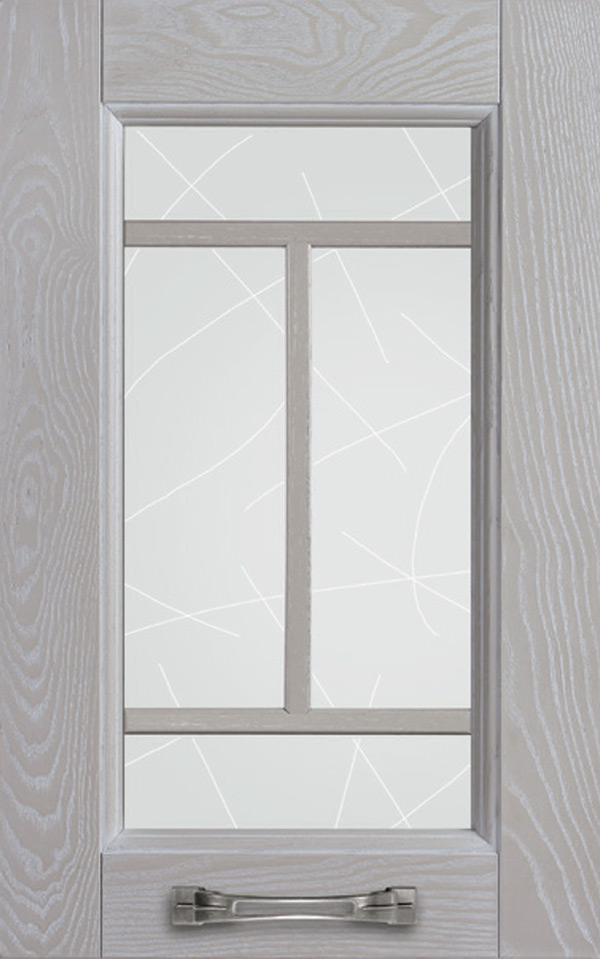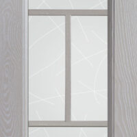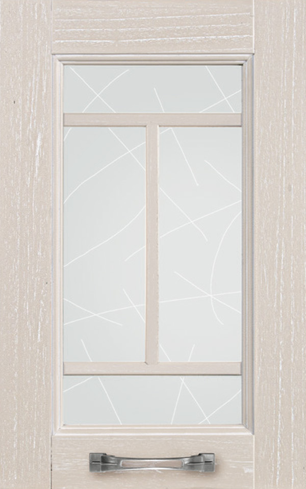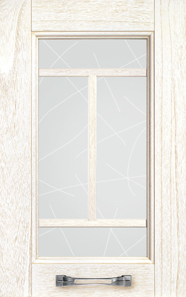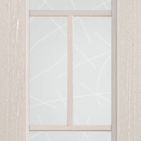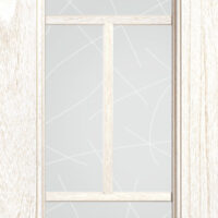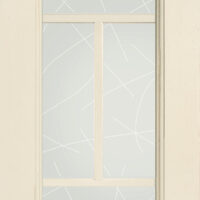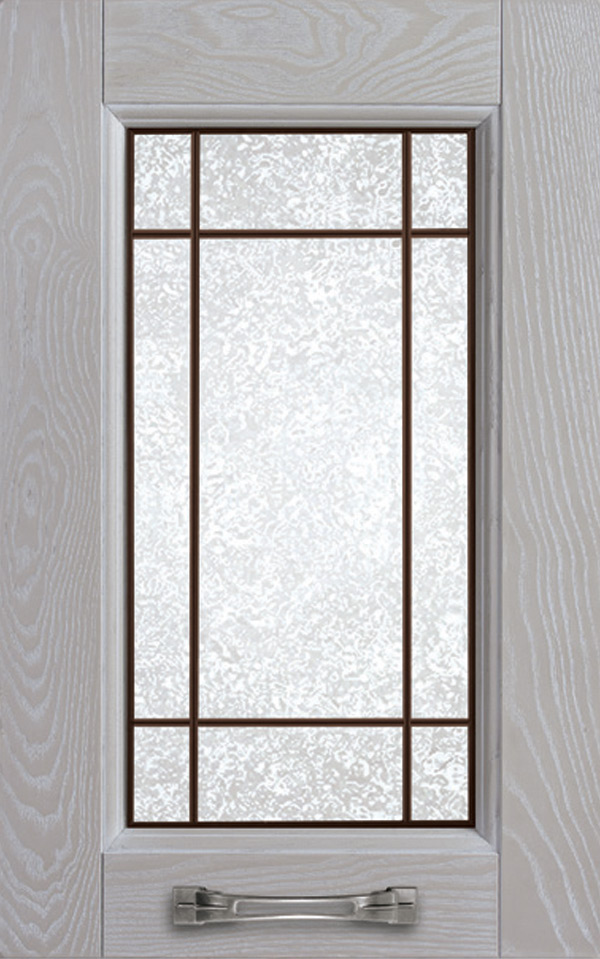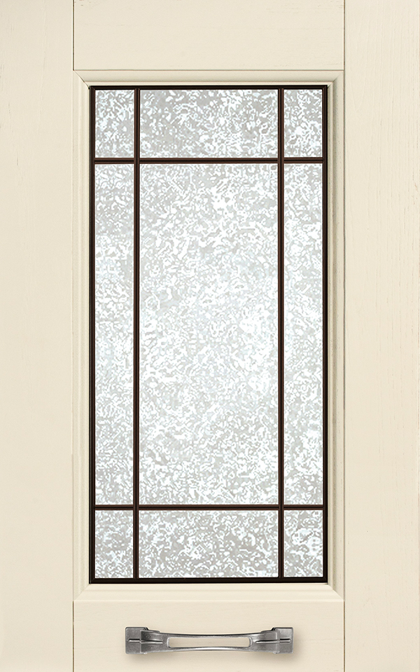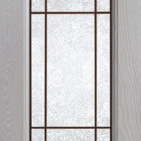 Telaio come ante piene con inglesina e vetro trasparente antico di spessore 4 mm temperato, oppure senza inglesina con vetro rilegato e serigrafato con rombi.