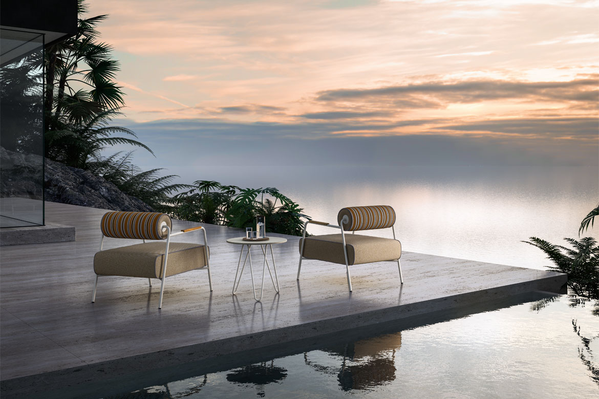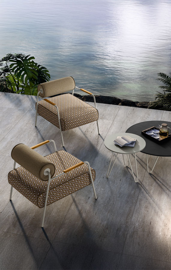 Ampia e poliedrica, perfetta per dar forma a svariate combinazioni, Levante è composta da: divano modulare, lettino reclinabile con ruote, lettino fisso, poltrona, sgabello e sedia, con e senza braccioli. Elementi caratterizzanti sono il piping, che borda il rivestimento in tessuto, interamente sfoderabile, e lo schienale a rullo, appoggio ribaltabile in alcuni casi, da spostare in base alle esigenze. Realizzate in poliuretano specifico per outdoor, le imbottiture interne sono totalmente drenanti, traspiranti e resistenti agli agenti atmosferici. Le strutture tubolari sono in acciaio Inox, disponibili con finitura satinata o nei colori Espresso e Seta. In accordo con i principi dell’economia circolare e della sostenibilità, tutti i pezzi della collezione sono facilmente disassemblabili.