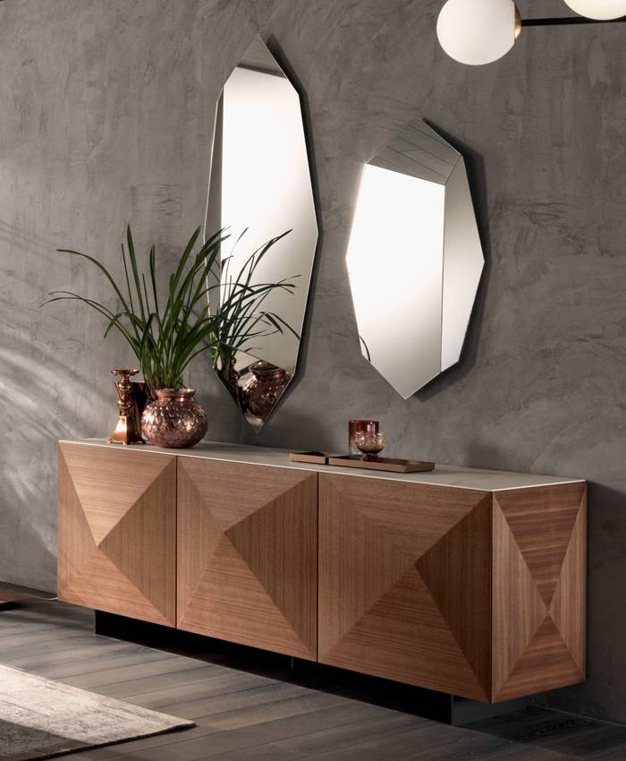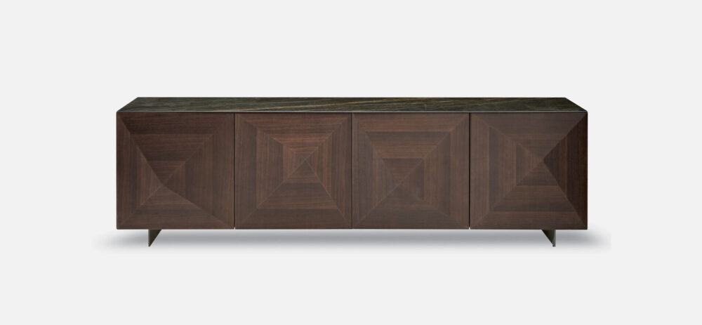 C-Wood è una madia interamente in legno. Le ante e i fianchi nascono da tranciati lavorati a mano seguendo la diamantatura nei quattro settori. Piccole irregolarità e uniformità di colore sulle ante sono dovute alla lavorazione artigianale del legno.