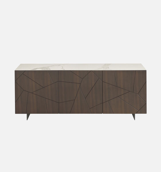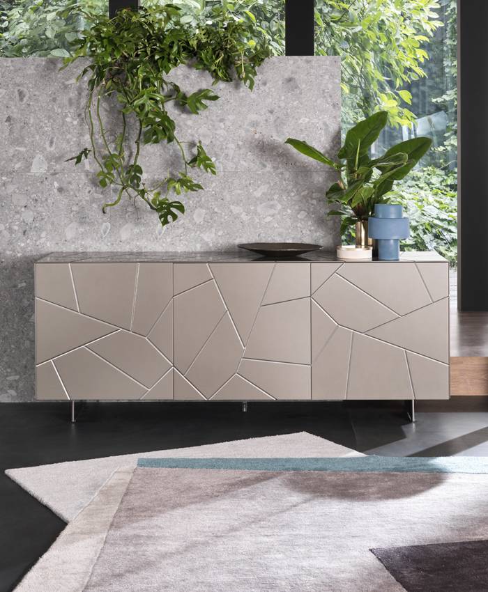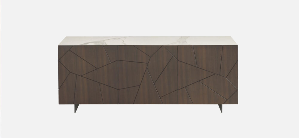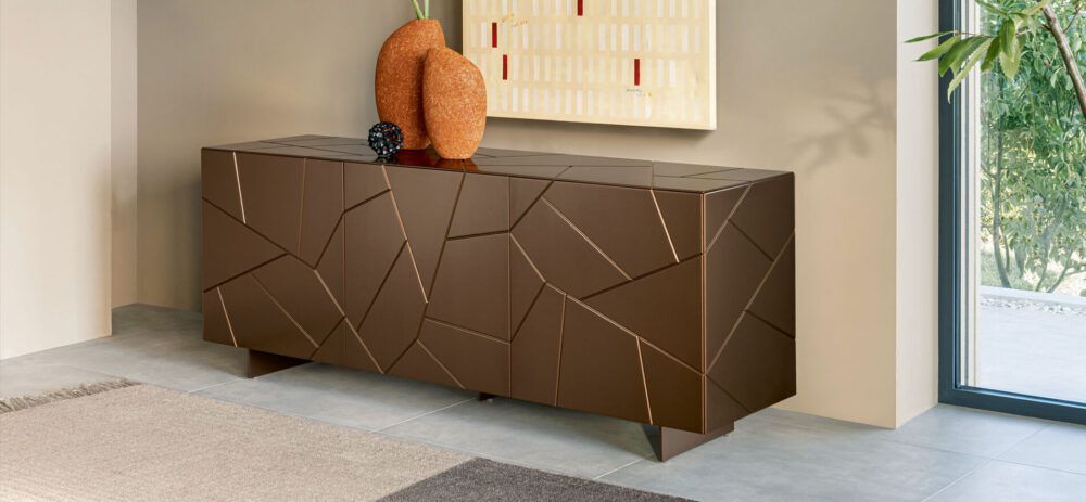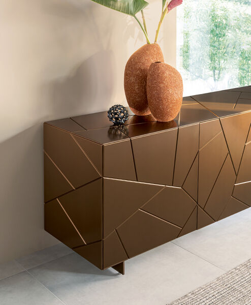 MADIA O CREDENZA CON SUPERFICI INCISE, PIANO IN LEGNO, CERAMICA O CRISTALLO SPECCHIANTE