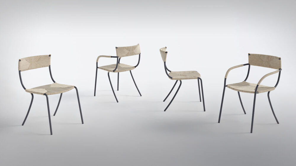 Elide è una sedia leggera e funzionale, disponibile in versione con o senza braccioli. La struttura in metallo verniciato nero epossidico si distingue per il profilo sottile e continuo, terminante in due dettagli in ottone. Schienale e seduta sono intrecciati a mano in corda di carta resistente all’umidità, esprimendo un equilibrio tra artigianalità e rigore industriale. Pensata per ambienti indoor combina materiali e finiture in una forma sobria ma distintiva.