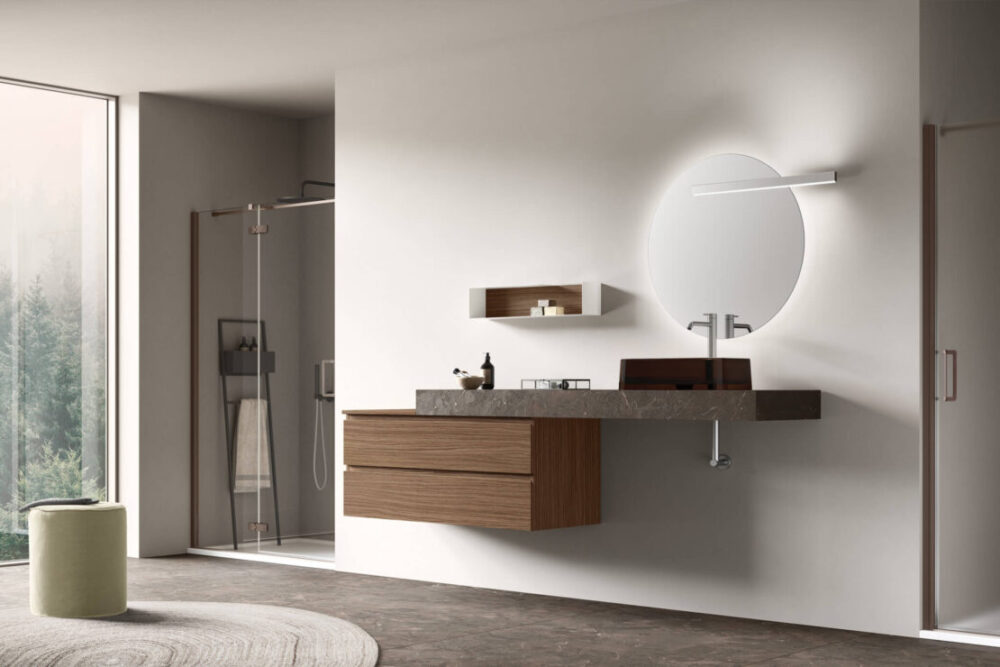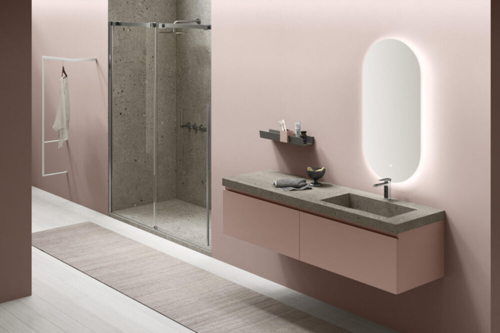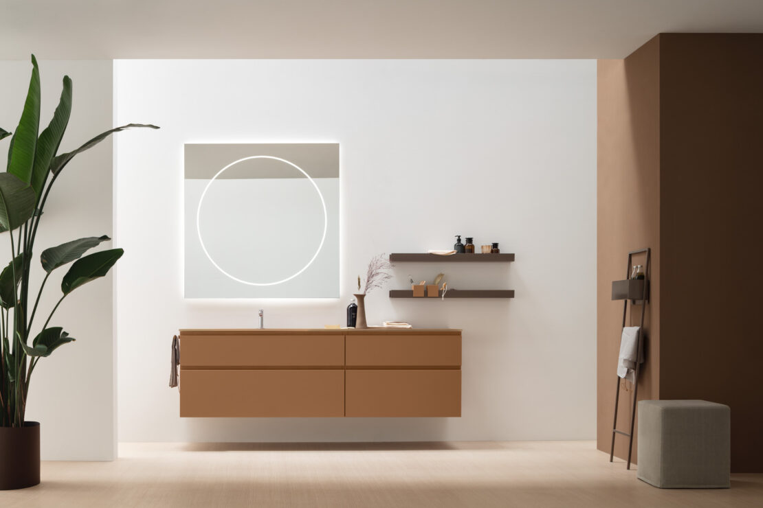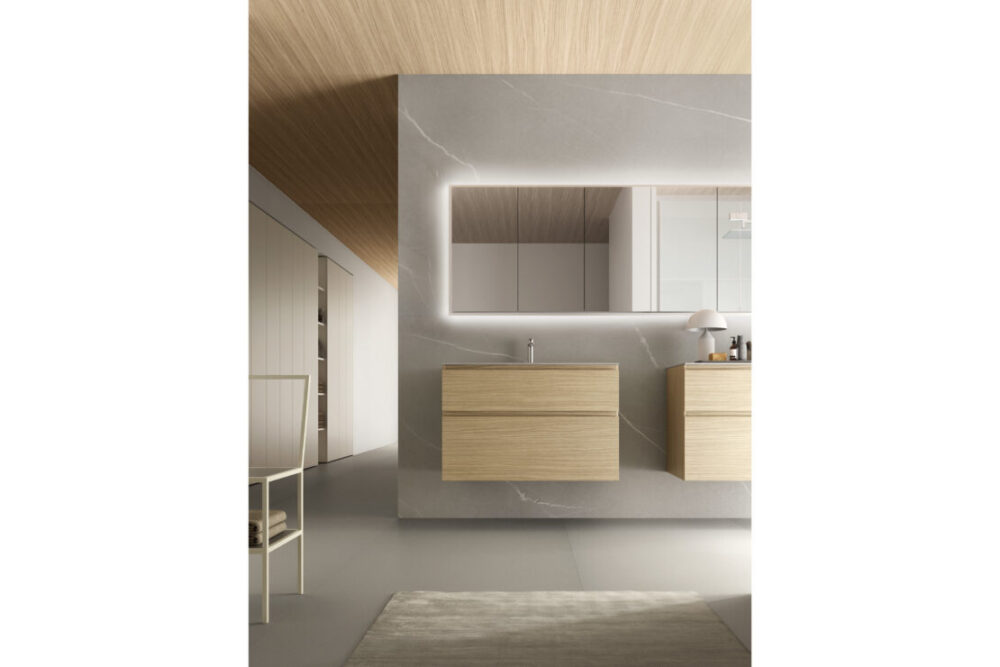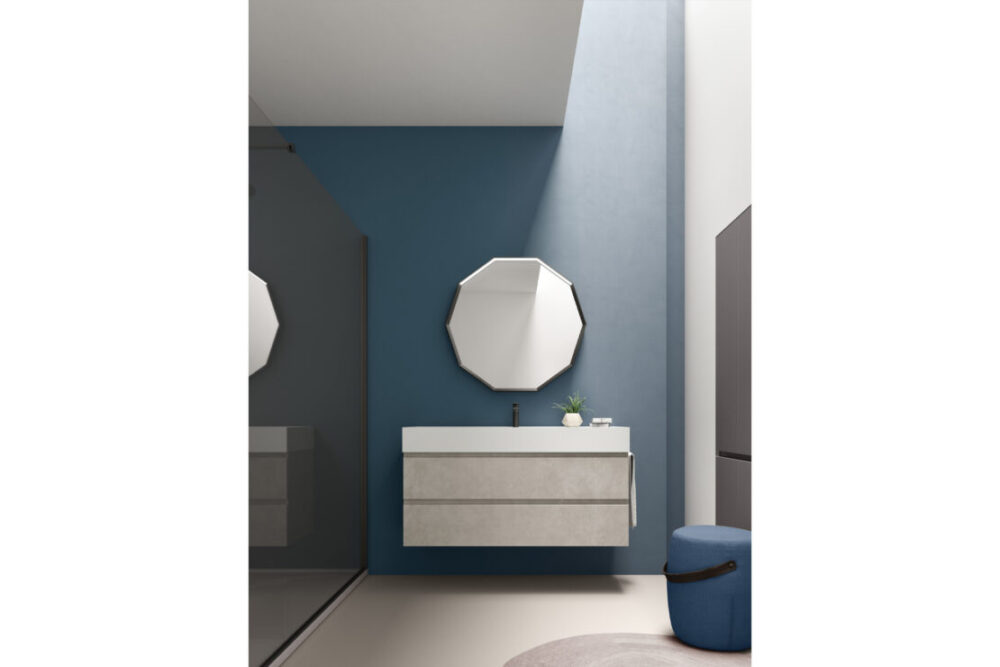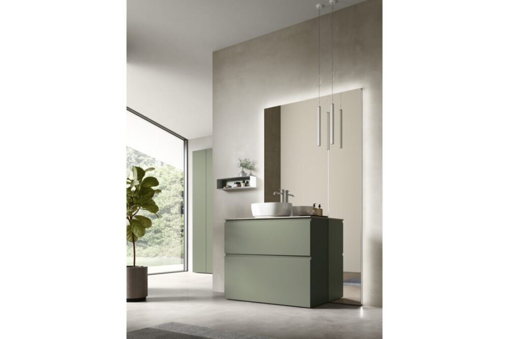 Il profilo superiore, inclinato e leggermente smussato, richiama la forma dell’omonimo segno grafico “/”. È il tratto che definisce il design della collezione e che favorisce l’apertura di ante e cassetti nell’arredo bagno. Una soluzione dall’estetica pulita, personalizzabile nelle finiture melaminiche o laccate, disponibili in versione opaca o lucida. Perfetta per arredare bagni moderni.