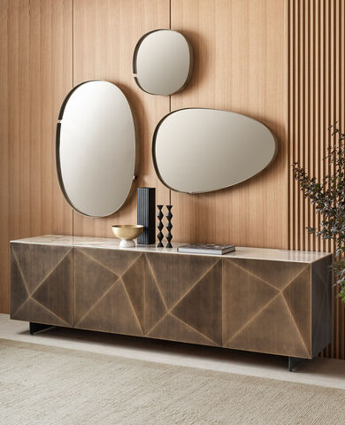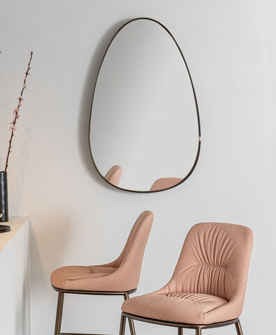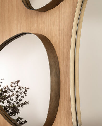 Forme armoniose, sagome morbide, prive di spigoli, per lo specchio Lumière, dai dettagli di forte impatto, come la sottile cornice in metallo che avvolge il profilo dello specchio; essa pare aumentare la luminosità della superficie specchiante, arricchendola di ulteriori riflessi, dati dalla profondità.