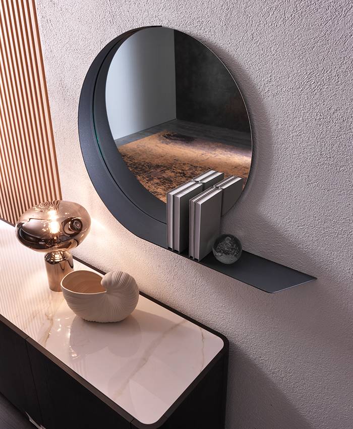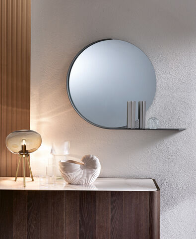 Nello specchio Madame la cornice avvolge la circonferenza della superficie riflettente e va oltre, prolungando la sua propaggine fino a farsi grazioso piano d’appoggio. Integrati tra loro, specchio e mensola, danno a vita un abbraccio sinuoso che rimanda ad una netta sensazione di equilibrio e di eleganza.