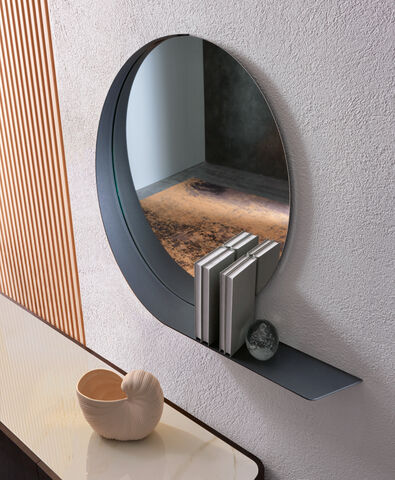Madame è uno specchio tondo con cornice mensola destra in metallo verniciato.