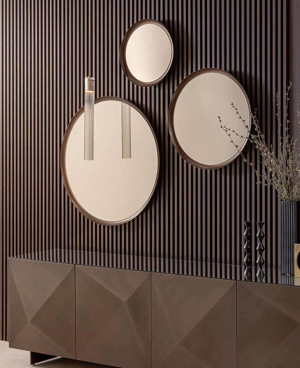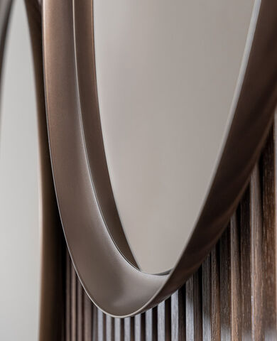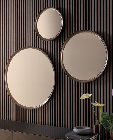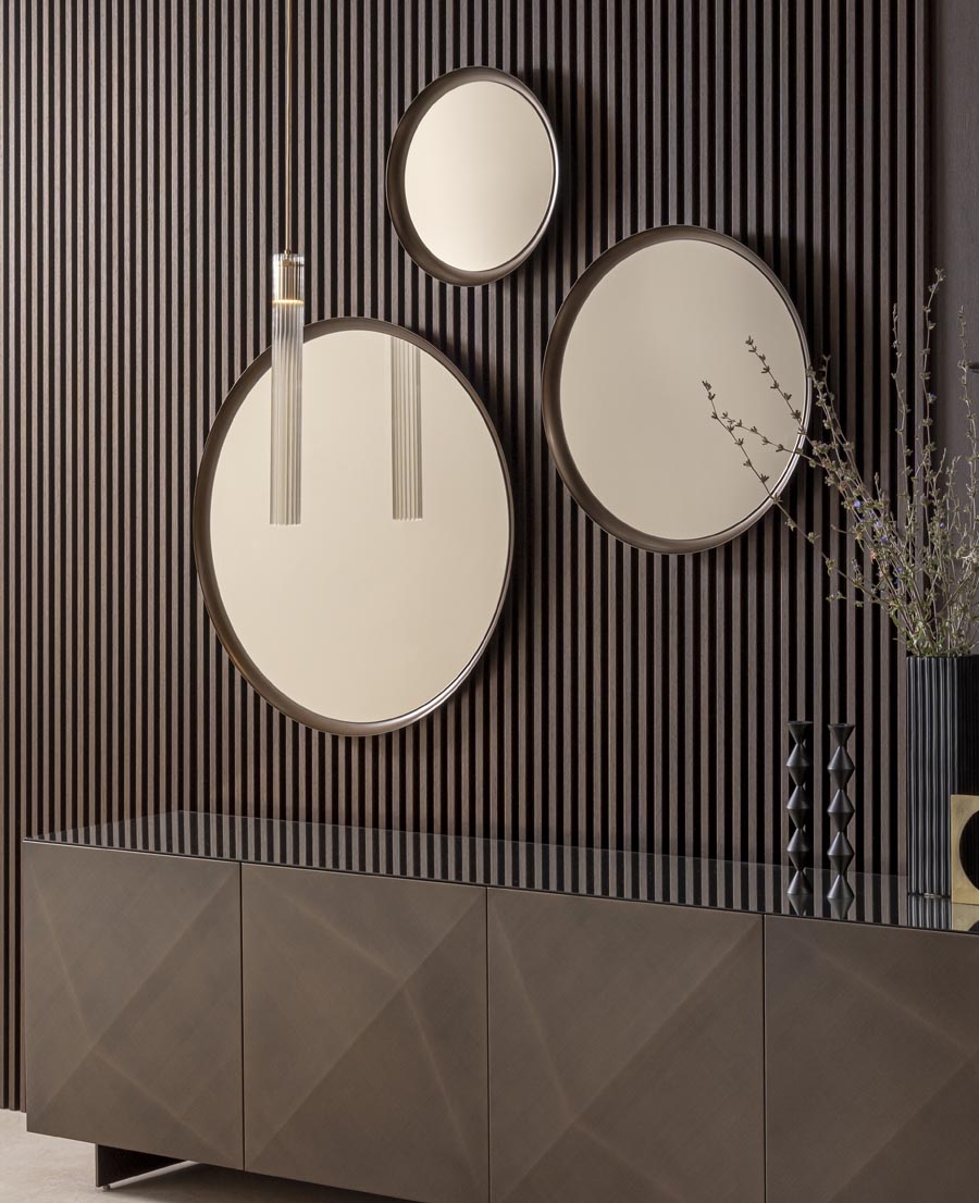 Gli specchi Ring incarnano l’eleganza pura e il fascino senza tempo. Disponibili in quattro dimensioni, si adattano con grazia ad ogni spazio, riflettendo non solo l’immagine, ma l’anima stessa dell’ambiente. La loro cornice in metallo verniciato bronzo abbraccia il cristallo specchiante bronzato, creando un gioco di luci e riflessi che avvolge lo sguardo in un’atmosfera calda e sofisticata.