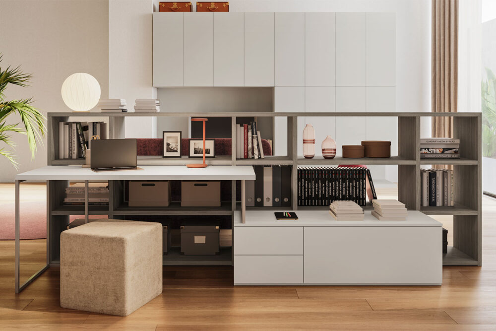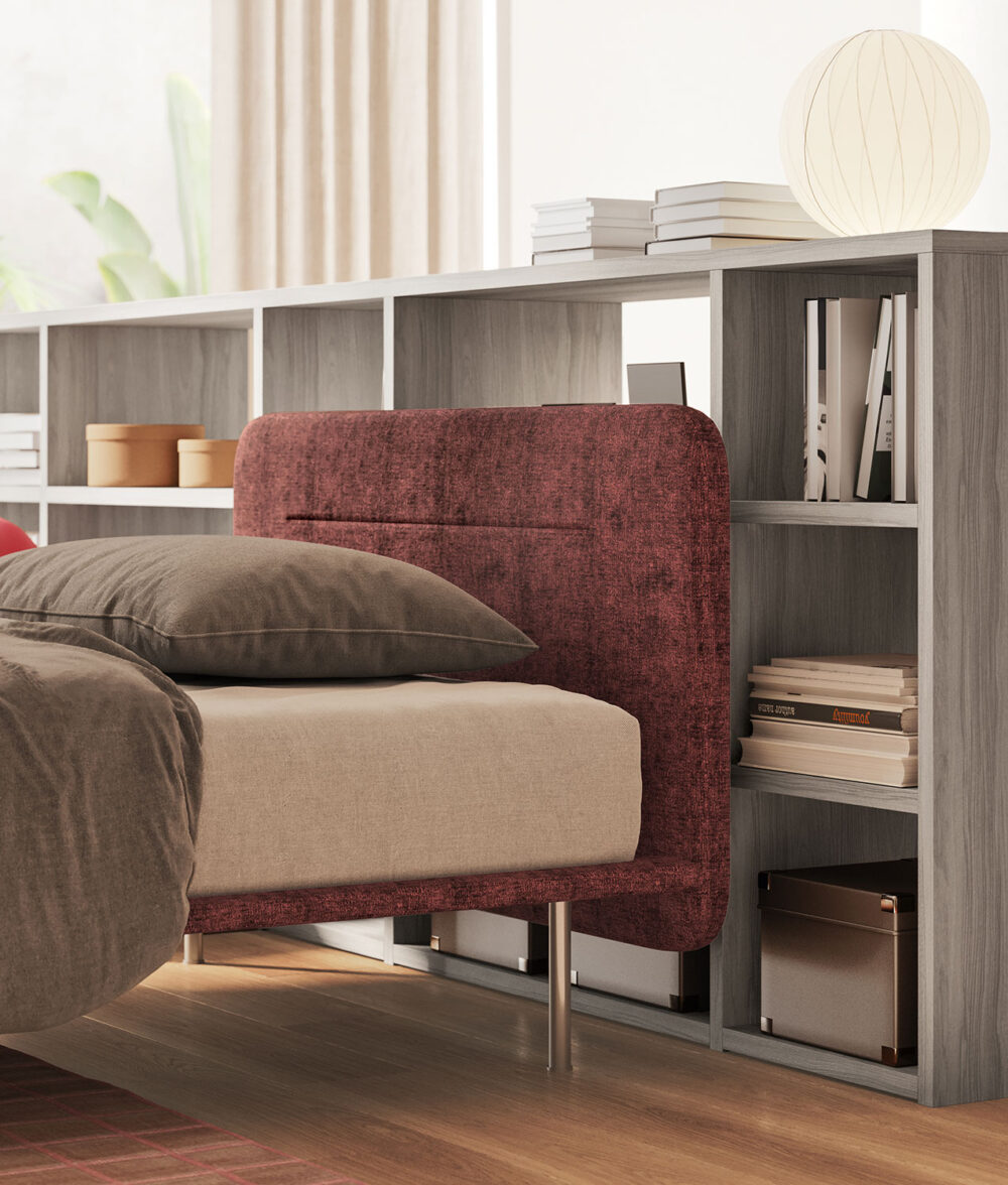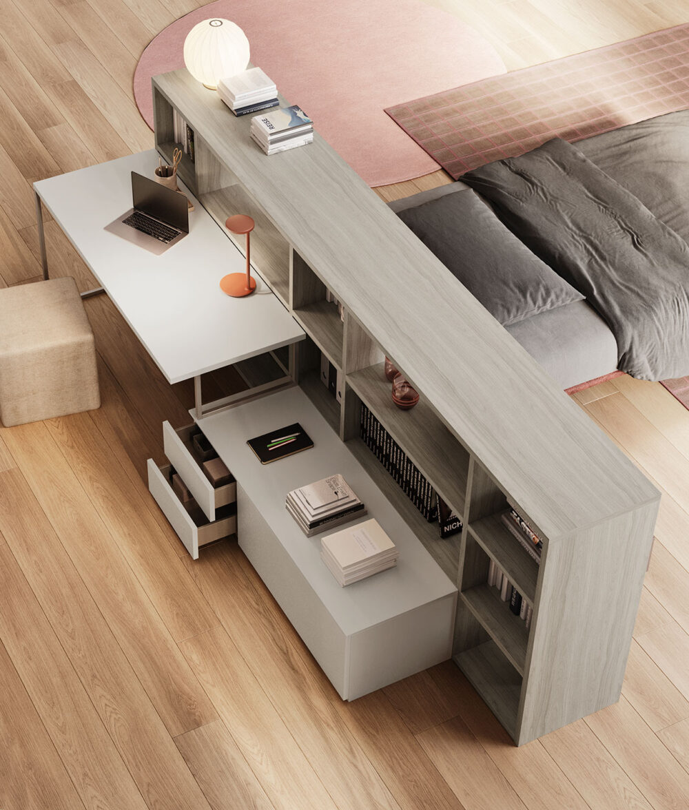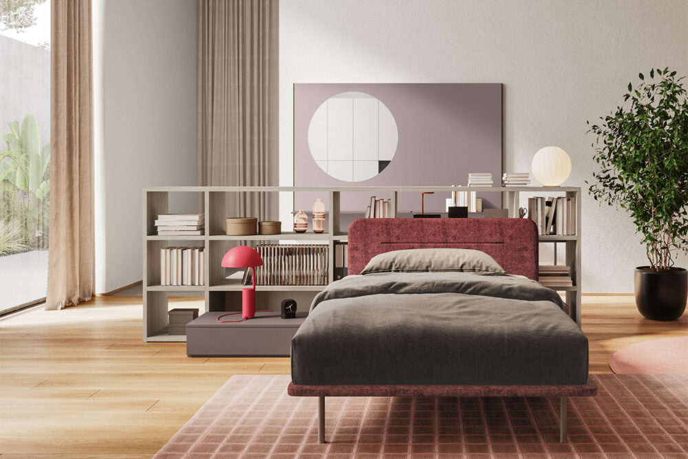 Attenta alle esigenze dell’abitare contemporaneo, Start P15 presenta una suddivisione dello spazio in tre aree funzionali, ognuna delle quali risponde ad un’esigenza specifica: dormire, contenere, studiare. Il centro stanza è occupato da Narvi, un letto imbottito con testiera morbida e giroletto sottile sostenuto da 4 piedini alti di forma cilindrica. Disponibile anche singolo, è scelto nel modello a una piazza e mezza per restituire un piano di riposo ampio e aumentare, così, il livello di comfort durante il sonno. Affiancato da un comodino a terra, trova appoggio su una libreria divisoria bassa aperta e accessibile su entrambi i lati. Progettata per contenere libri, volumi, riviste e piccoli accessori decorativi, è utile anche per separare la zona del riposo da quella del lavoro. L’angolo studio è infatti installato dietro la libreria, dove trovano posto una scrivania in appoggio su una base a cassetti usata come mobile contenitore per cancelleria. Semplice nella forma, lo scrittoio appartiene alla collezione Kios, i cui complementi sono caratterizzati da piedi, gambe, supporti e strutture metalliche in perfetto stile industrial moderno.