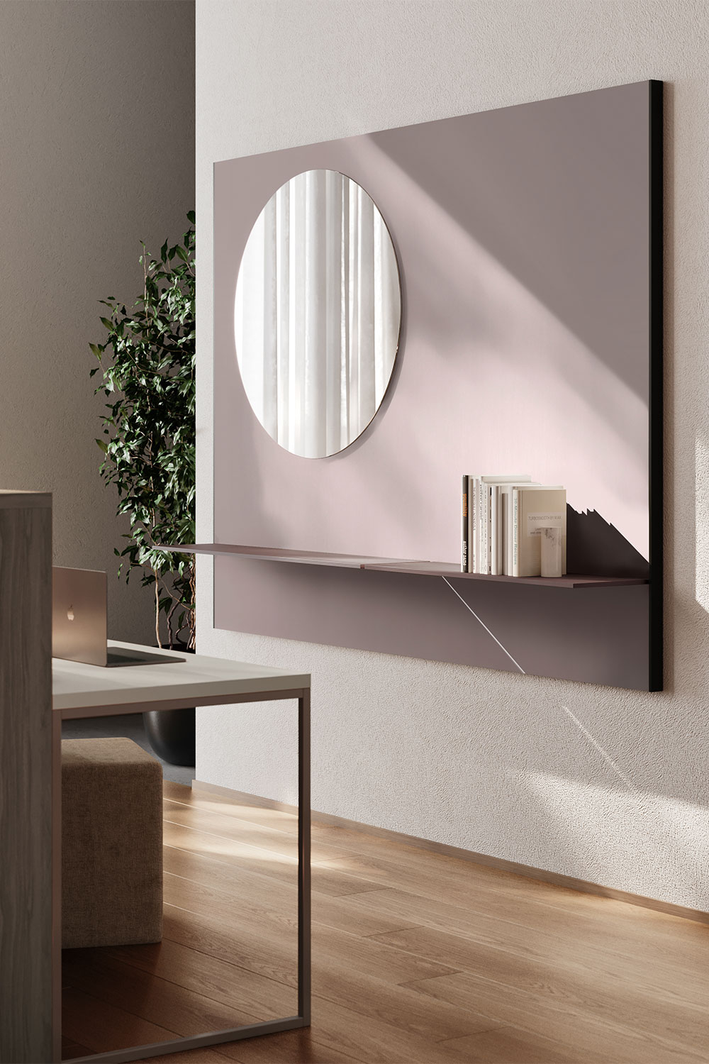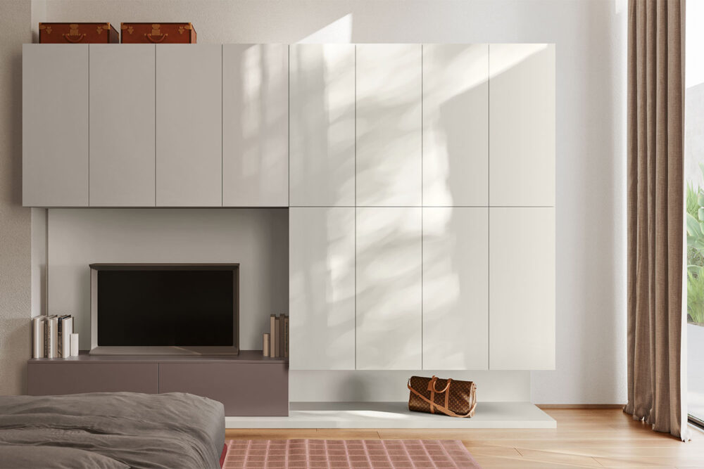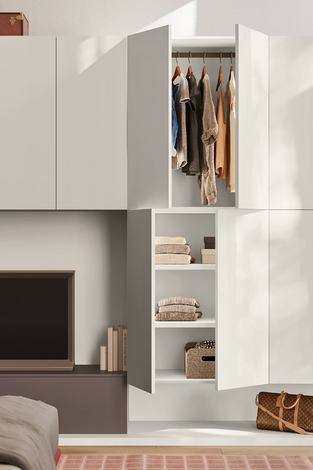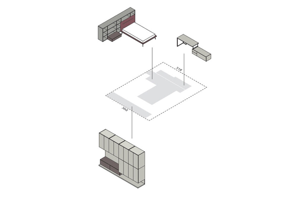 Se letto, libreria e scrivania occupano la parte centrale della camera, la zona guardaroba è invece concentrata su una delle pareti disponibili. Le necessità di contenimento sono risolte da un grande armadio a ponte, sospeso da terra per restituire un’impressione di leggerezza. Fissato su pannelli di boiserie, l’armadio è suddiviso in moduli alti e bassi, tutti dotati di apertura tramite push-pull al posto delle tradizionali maniglie decorative. La pulizia estetica la semplicità formale sono confermate dal mobile TV, costituito da due basi con in appoggio su una panca sottile.