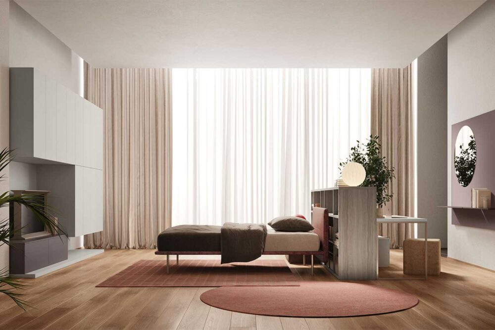 Adatta alla stanza di un’adolescente o una ragazza grande, Start P15 è una cameretta con armadio a ponte e libreria divisoria moderna ed elegante, componibile e personalizzabile per colori, finiture, dimensioni e disposizione degli elementi. Completa di letto imbottito e angolo studio, questa camera si propone una soluzione versatile e polivalente, adatta anche ad arredare il monolocale di una giovane donna in età adulta.