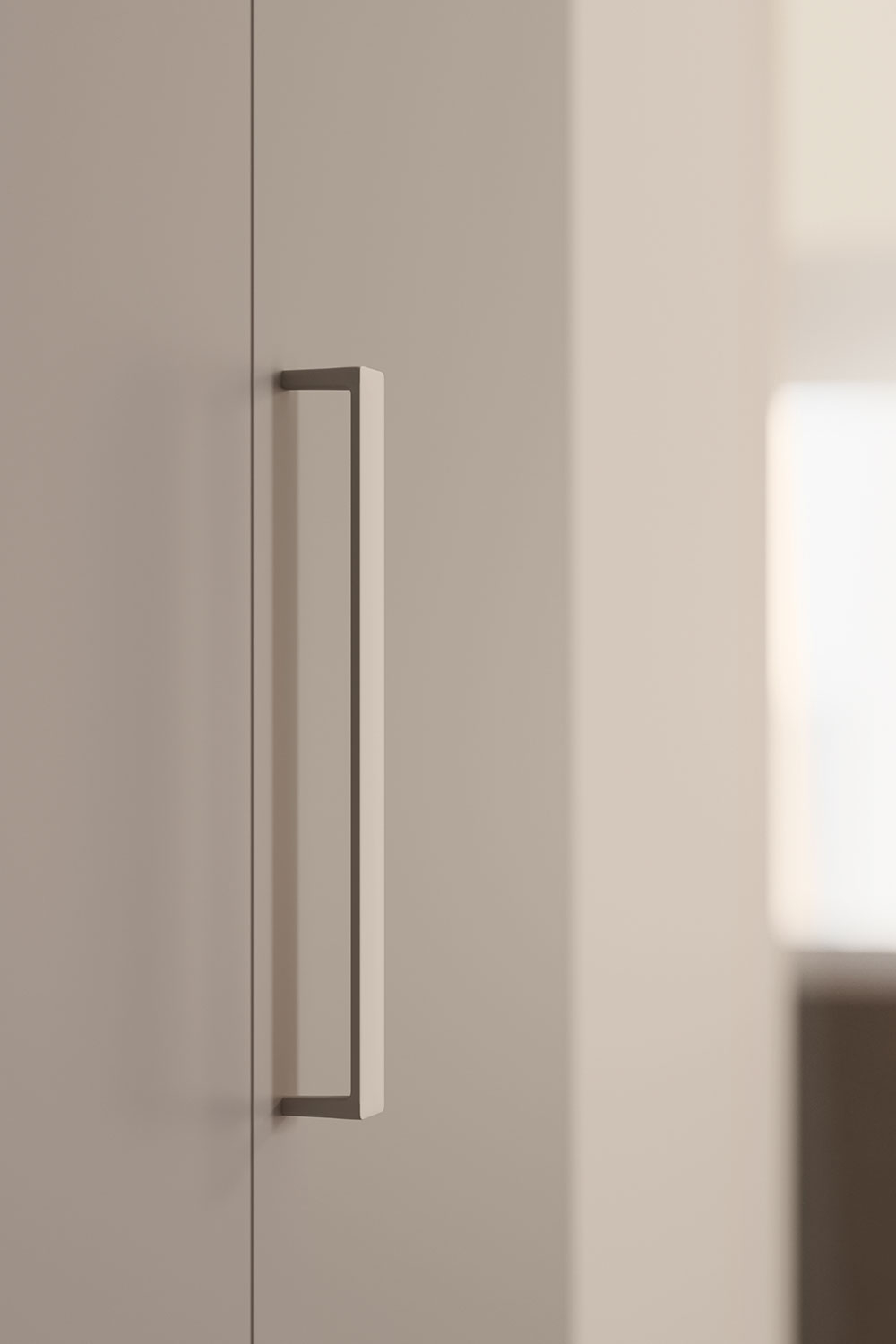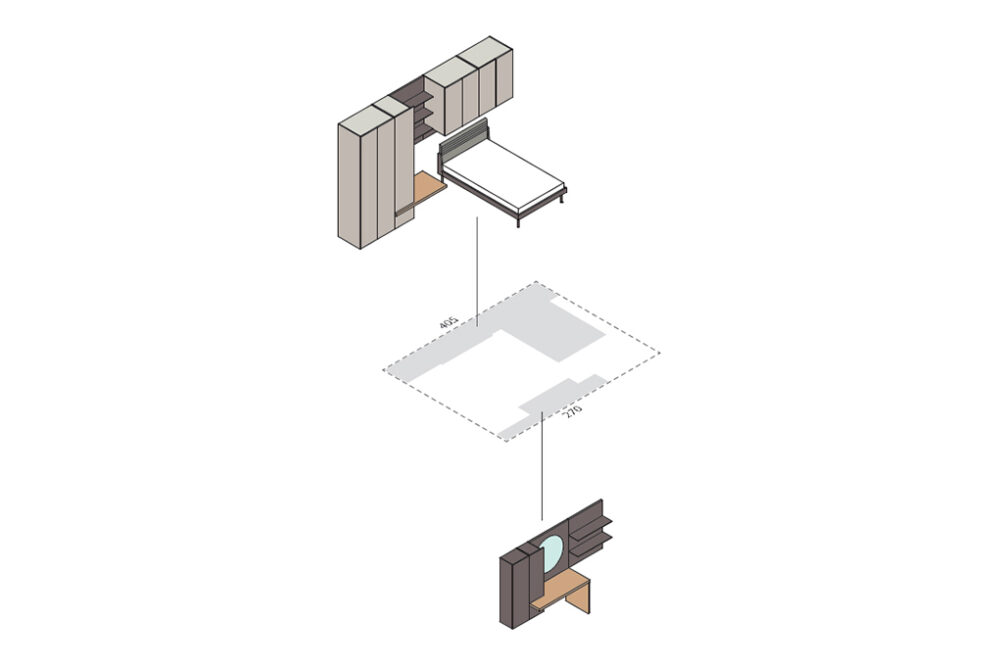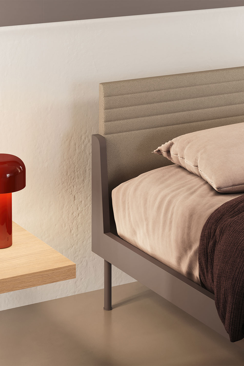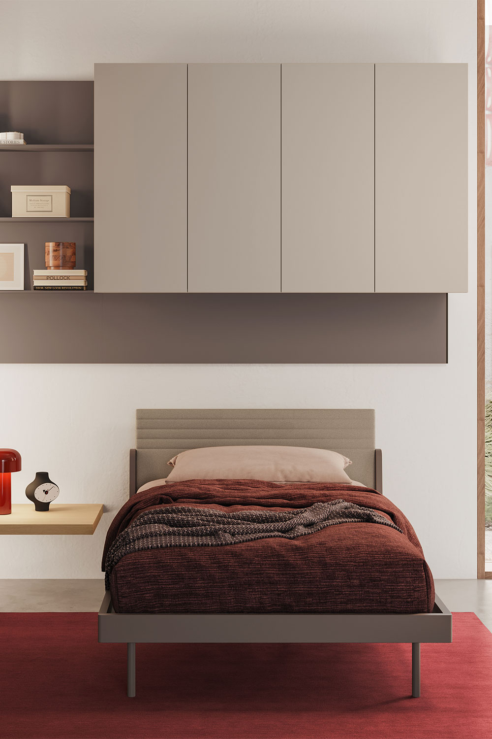 La configurazione a C lascia spazio sotto l’armadio per l’installazione di Kuma, letto imbottito dal design moderno in cui la combinazione di giroletto non imbottito e testiera tessile crea un piacevole contrasto materico. Sollevato su piedini alti, il piano di riposo può accogliere un materasso singolo, una piazza e mezza o matrimoniale a seconda delle esigenze di comodità e delle abitudini di comfort. Indispensabili per sistemare la sveglia, il cellulare, la foto-ricordo delle vacanze, una abat-jour e l’ultimo bestseller acquistato in libreria, due piani d’appoggio sono offerti da una mensola integrata all’armadio e da un tavolino rotondo con base decorativa, valide alternative ai tradizionali comodini e complementi vincenti per creare una soluzione asimmetrica di forte impatto.