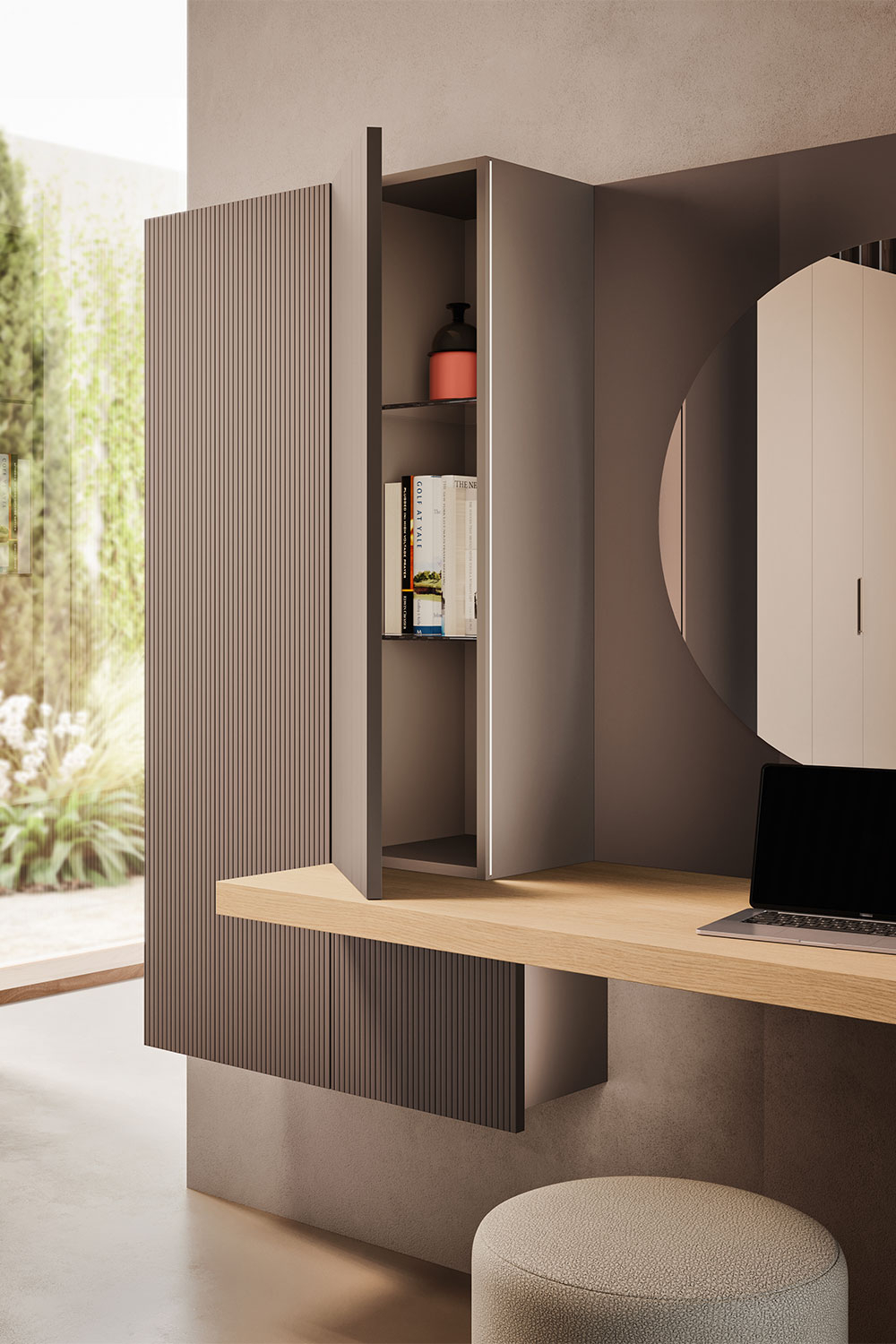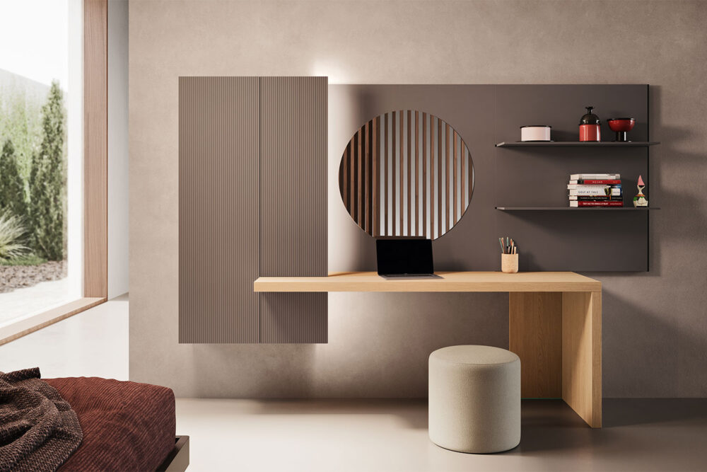 Un’attenzione speciale è dedicata all’angolo studio. In soli 270 cm di larghezza, la parete è attrezzata con uno scrittoio in color legno chiaro, pannelli modulari con mensole e due pensili contenitore sospesi. Allo stesso tempo raffinata e dinamica, la zona studio assume ancora più carattere grazie all’effetto scanalato delle ante decorative, all’asimmetria dello scrittoio e al sistema d’illuminazione LED che diffonde una piacevole luce d’ambiente.