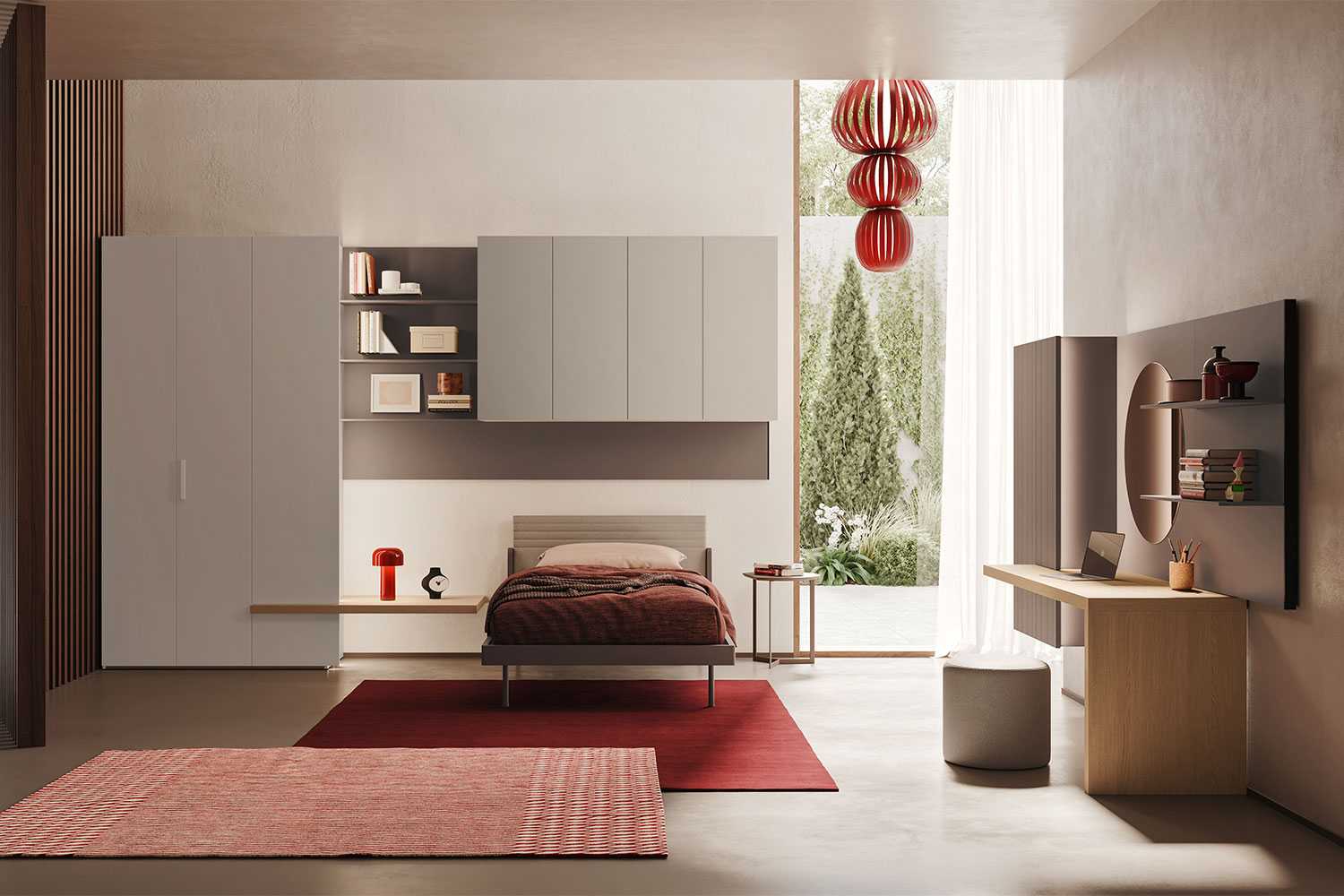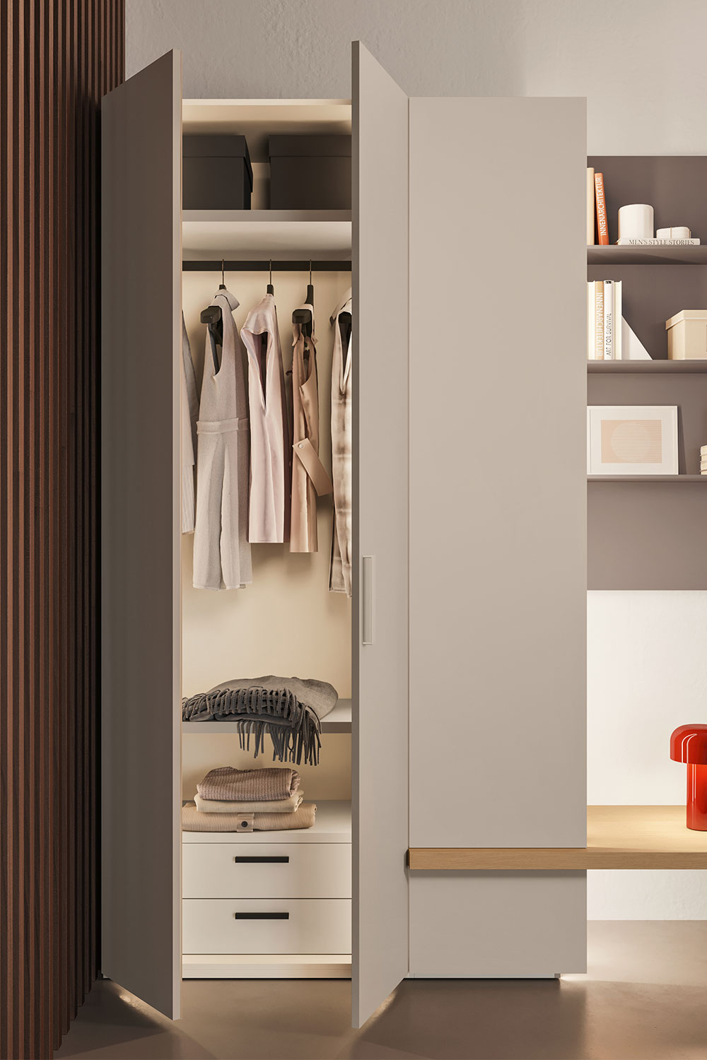 Dormire, contenere, studiare: le tre esigenze delle camerette per ragazzi a cui risponde una proposta d’arredo adatta alla stanza di una ragazza adolescente, sedicenne, diciottenne o ventenne. Protagonista della camera è il grande guardaroba componibile, una soluzione con ante battenti che rivisita il classico armadio a ponte suddividendolo in due zone contenitive separate. Al modulo sospeso a 4 ante si contrappone un guardaroba alto con maniglie, composto da un armadio accessoriato con cassettiera, ripiani, tubo appendiabiti e da un modulo terminale con frontale sporgente retro-illuminato. Lo spazio tra gli armadi – l’uno a ponte, l’altro a terra – è riempito da un pannello di boiserie attrezzato con mensole lineari sottili.