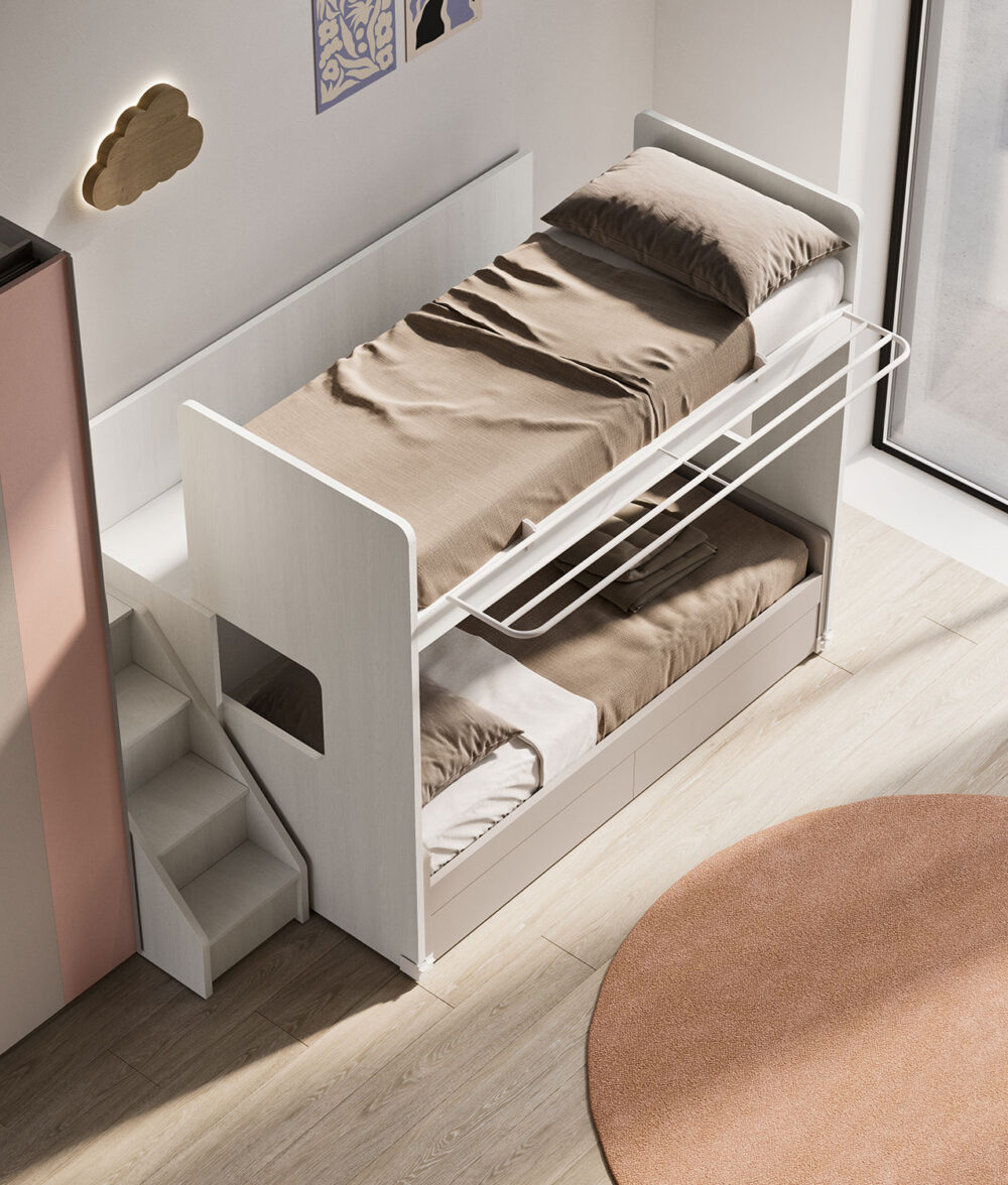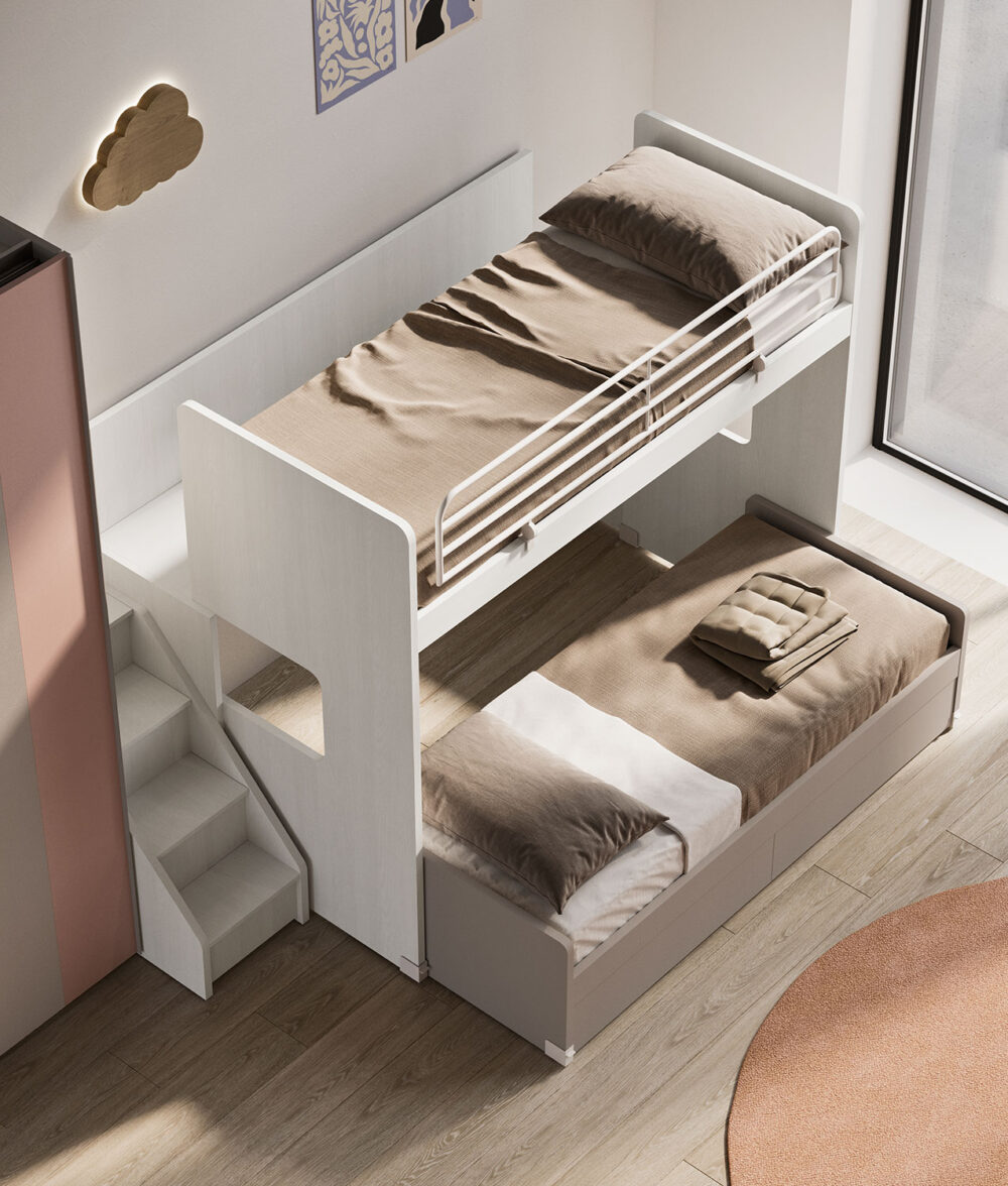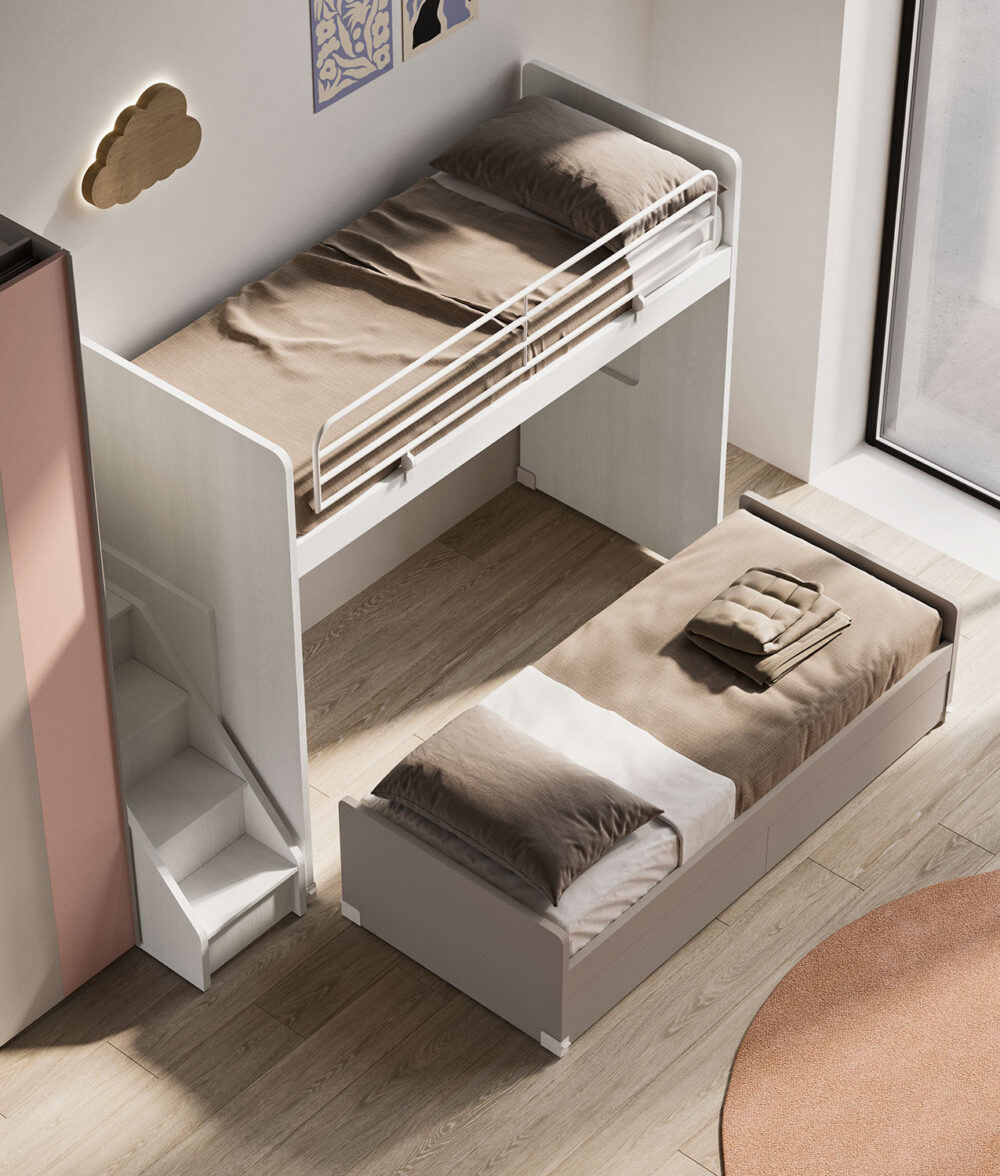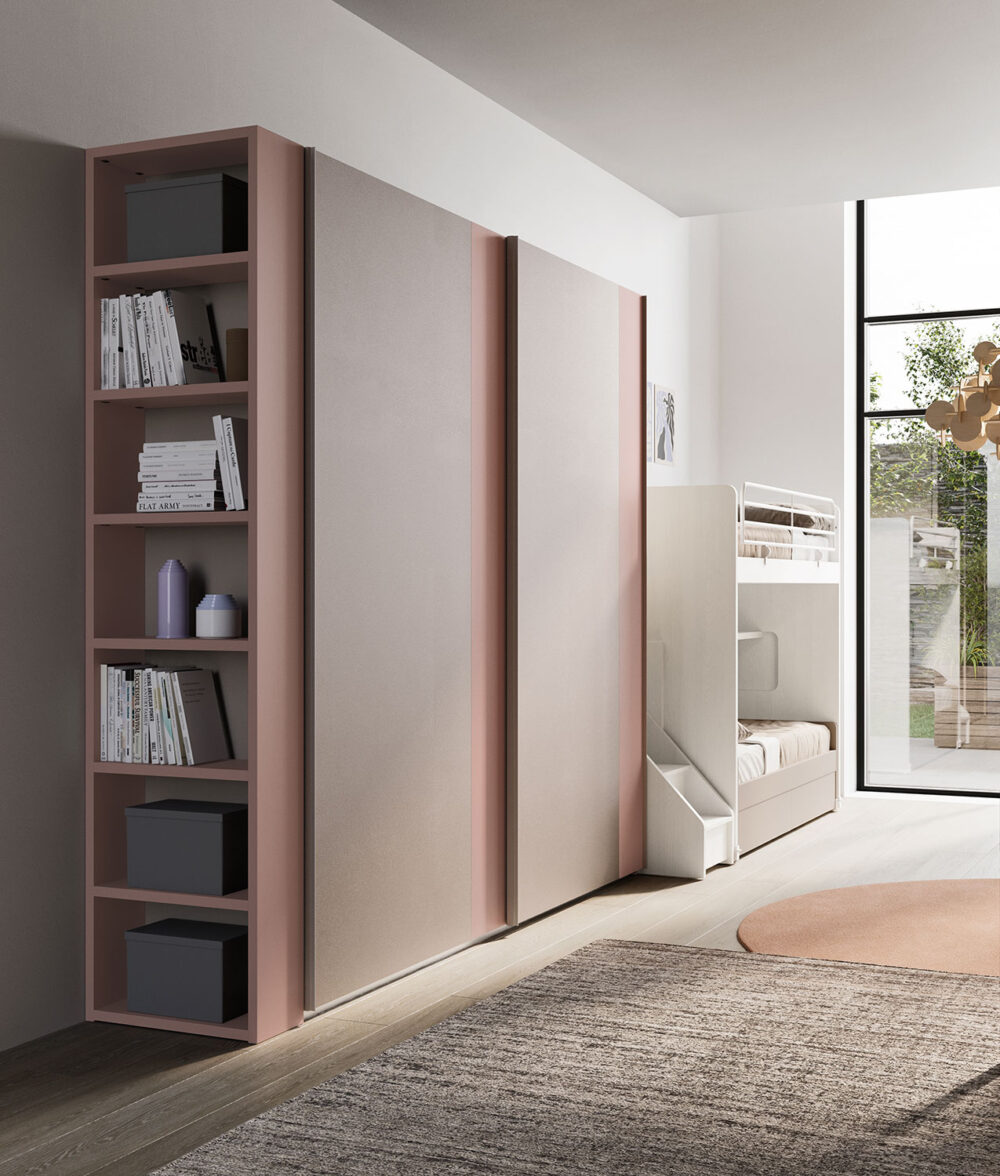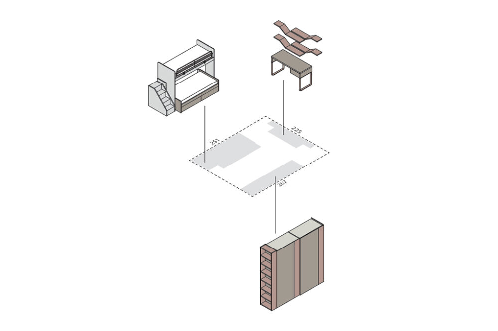 In questa cameretta doppia, lo spazio è suddiviso in tre aree funzionali ben distinte: zona notte vera e propria, guardaroba e angolo studio. Protagonista dell’ambiente è Slide, un letto a castello estraibile spostabile avanti e indietro a seconda delle necessità o dei momenti della giornata. Il movimento scorrevole della struttura a soppalco rende fruibile la salita tramite una scala a cassetti, accessorio indispensabile per aumentare il livello di capienza in ambienti di piccole dimensioni. L’accesso al lettino superiore è reso sicuro da una pedana-passerella posteriore, posizionata tra la parete e il letto e collegata a terra da quattro gradini-contenitore. Ulteriore protezione è offerta da Gate, una protezione metallica anticaduta reclinabile per agevolare il rifacimento del letto o la rimozione delle lenzuola. Il vano sotto il soppalco è occupato da Lobby, letto estraibile dotato di cassetti scorrevoli e di giroletto su ruote. La presenza delle rotelle, non scontata per un castello, rende lo spostamento agile, facilita le operazioni di pulizia e consente di modificare l’assetto degli arredi nella stanza in base alle esigenze.
