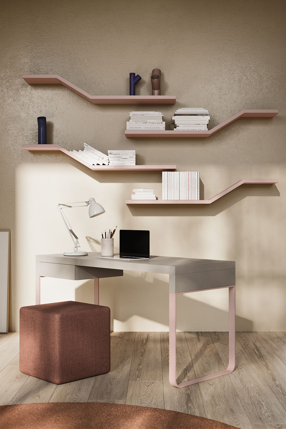 E infine, la zona studio. L’angolo dedicato ai compiti e alle attività intellettuali è allestito con una scrivania con cassetto sottopiano e una combinazione di mensole asimmetriche. Slitta, lo scrittoio, e Star, le mensole, danno vita a una parete attrezzata di piccole dimensioni, semplice nella forma e nel design ma altamente funzionale in un’ottica di ottimizzazione dello spazio.