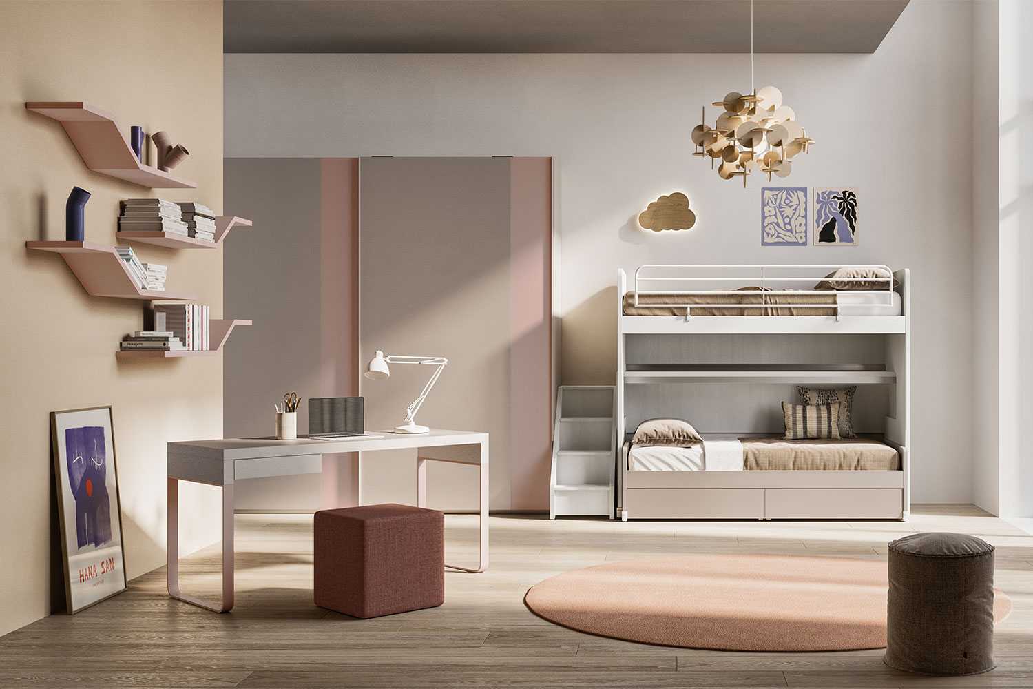 Start S26 è una moderna cameretta a soppalco lineare scorrevole, una soluzione salvaspazio per stanza piccole o lunghe e strette condivise da fratelli o gemelli. Progettata per la camera di due sorelle di età compresa tra gli 8 e i 10 anni, la soluzione è componibile e personalizzabile in finiture, colori ed elementi per rispondere anche alle esigenze di ragazzi e ragazze più grandi.