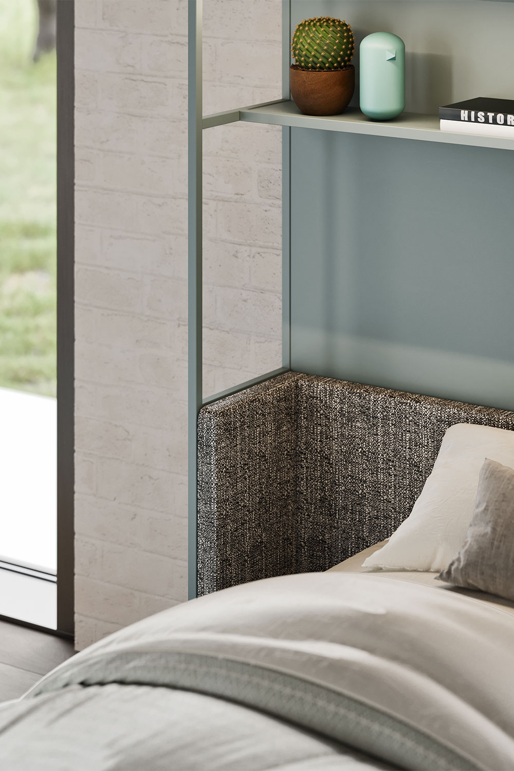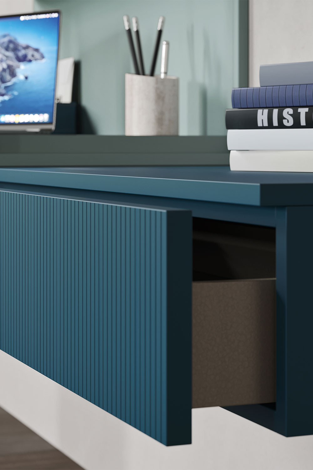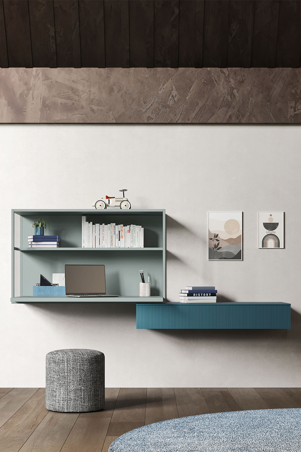 Pensata per arredare la camera di un ragazzo ma perfetta anche nella stanza di una ragazza, la composizione è completa di tutto il necessario per studiare, dormire e contenere. Protagonista dell’ambiente la grande testiera attrezzata con schienale, mensola, illuminazione LED e cuscino di testata imbottito che avvolge il letto. Minimalista e sottile, il giroletto è sorretto da due piedi in vetro trasparente che sembrano far fluttuale il piano di riposo a mezz’aria. Novità della collezione, i supporti invisibili restituiscono una sensazione di leggerezza visiva senza pari, a sua volta enfatizzata dall’installazione a parete della scrivania a muro. Ed è proprio Kios, scrittoio sospeso da parete, a dare un twist decorativo a un angolo studio minimalista e discreto. Inserito in una struttura metallica ton sur ton, il piano di lavoro è abbinato a un cassetto sospeso con frontale scanalato di forte impatto decorativo.