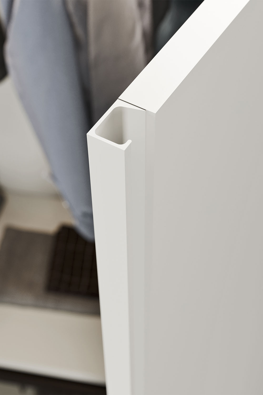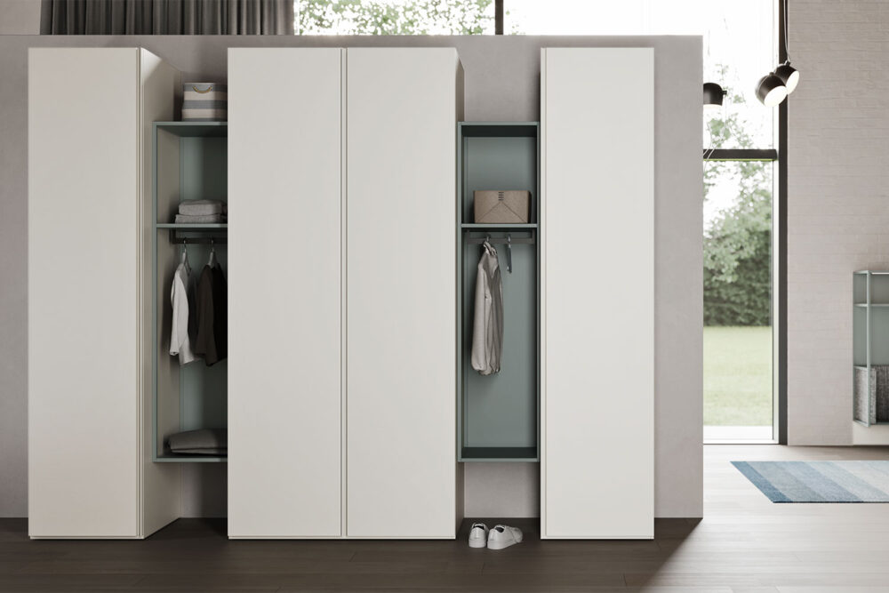 Ultima ma non meno importante, la zona guardaroba. Il tradizionale armadio a 4, 5, 6 o più ante lascia il posto a una soluzione alternativa basata sull’alternanza di moduli pieni e vuoti, di colonne contenitore con maniglia a tutta altezza e appenderia sospesa. Il vano centrale, il maggiore della composizione, è allestito internamente con accessori come cassetti, ripiani divisori, cestoni estraibili e luci integrate. Ulteriore spazio è offerto dall’armadio sospeso accanto al letto, più piccolo ma altrettanto capiente.