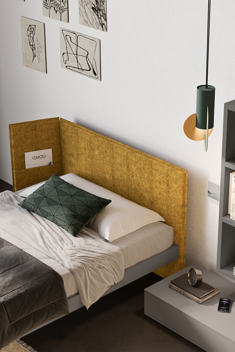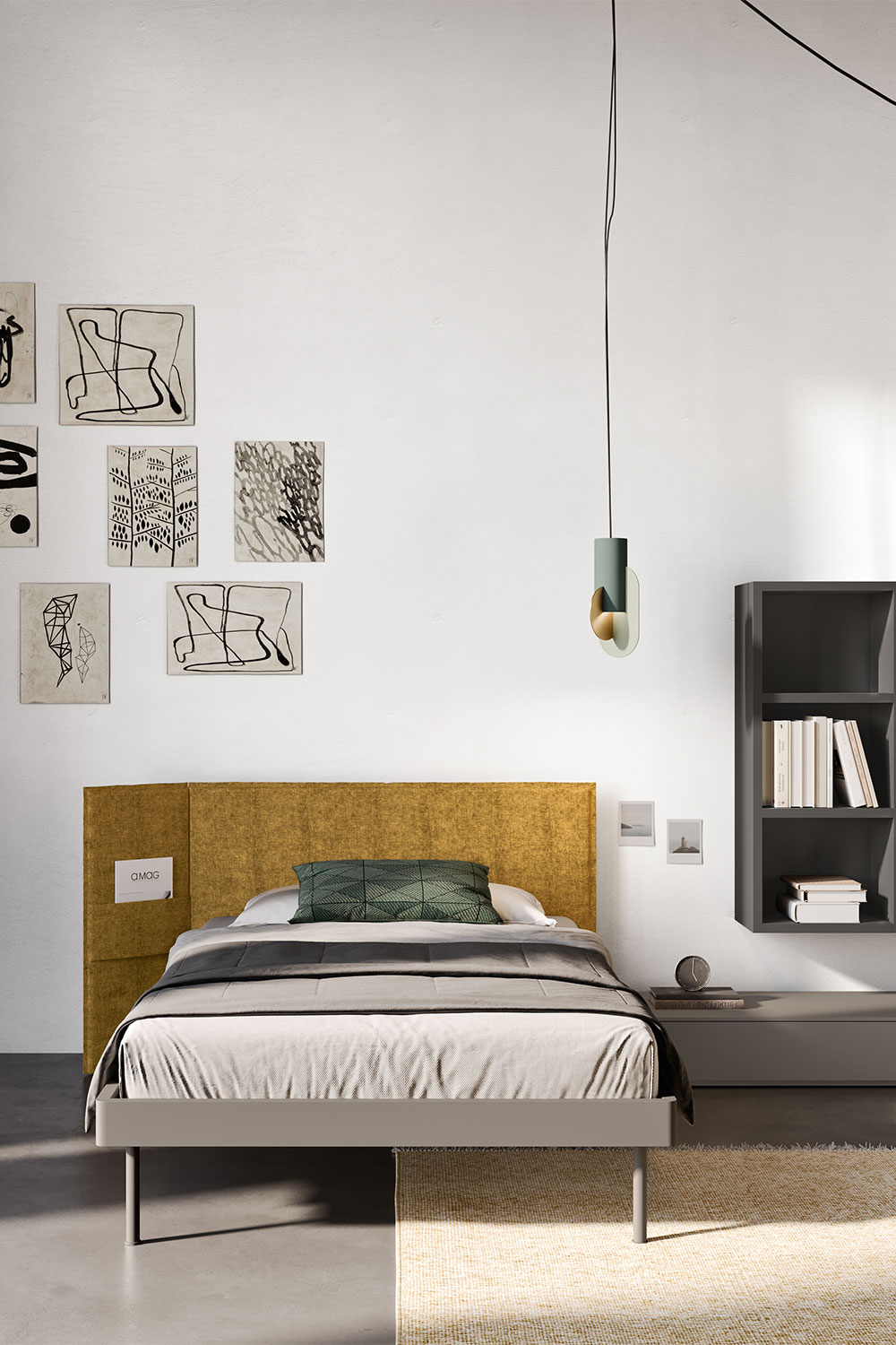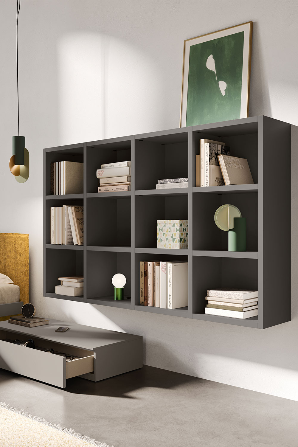 Completano la stanza-studio una base bassa con cassetto, posizionata accanto al letto in qualità di comodino alternativo, e una libreria a parete, sospesa al muro per non occupare ulteriore spazio a terra.