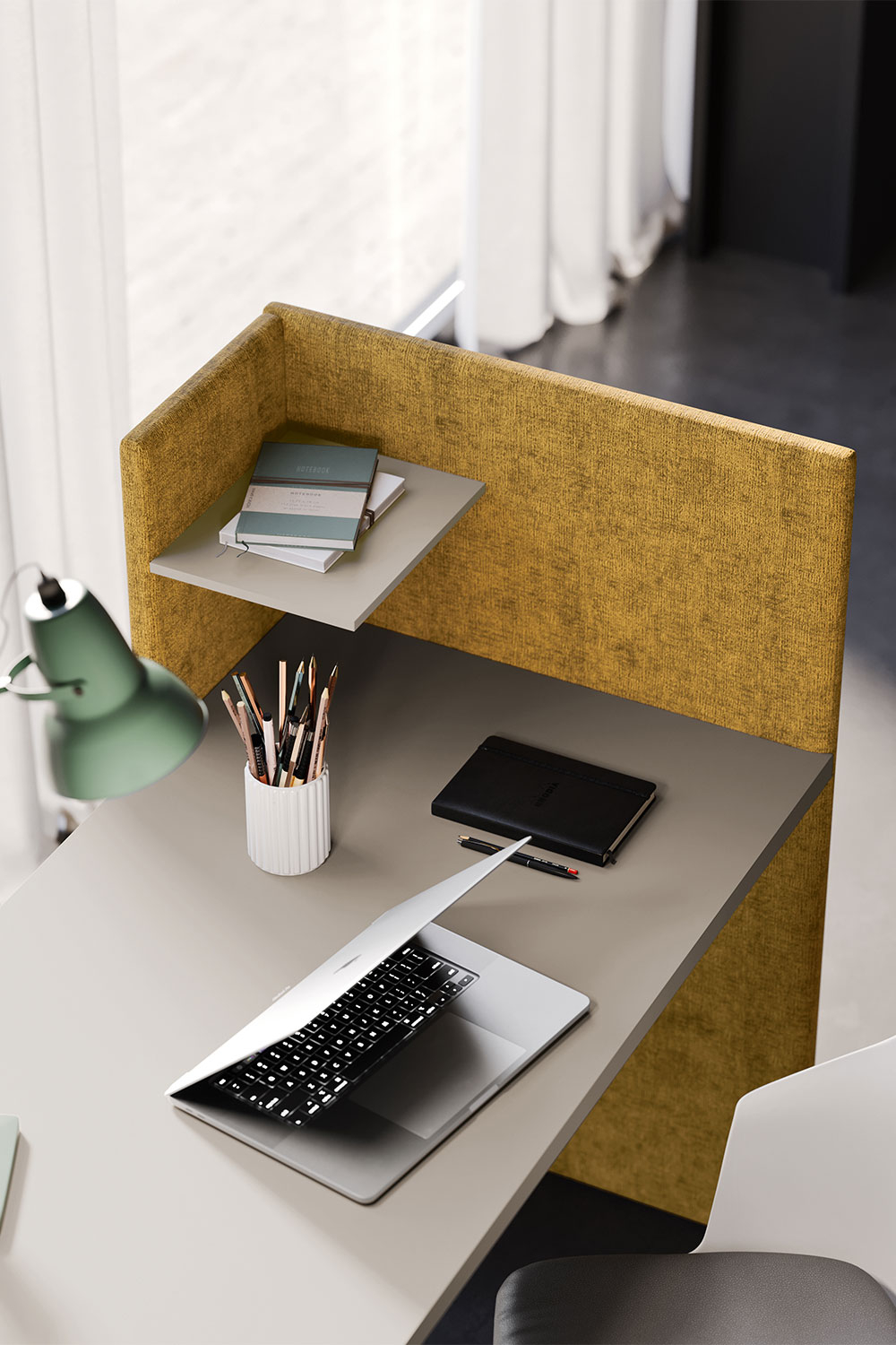 L’originale silhouette della testiera si ritrova anche nella zona studio, che accoglie una scrivania free standing attrezzata con un pannello divisorio laterale con mensolina integrata. Il piano di lavoro, sorretto da una gamba in metallo dal design minimalista, è a sua volta dotato di un cassetto inferiore utile come portadocumenti o svuotatasche.