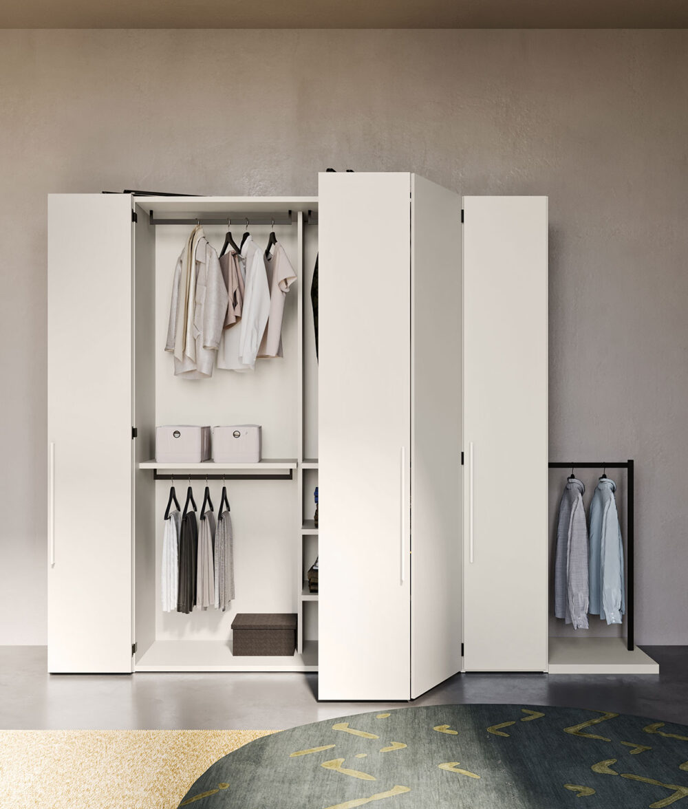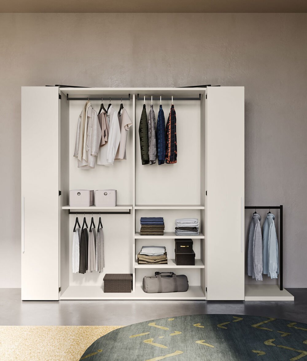 La zona guardaroba è allestita con una grande cabina armadio completamente apribile grazie a un sistema di apertura a pacchetto. Le ante centrali si piegano su loro stesse per svelare uno spazio contenitivo capiente e multifunzionale da personalizzare con accessori interni o affiancare a colonne modulari della collezione Start. Ultimo ma non meno importante, l’armadio accoglie anche Ambrogio, un funzionale appendiabiti da terra in metallo brunito.