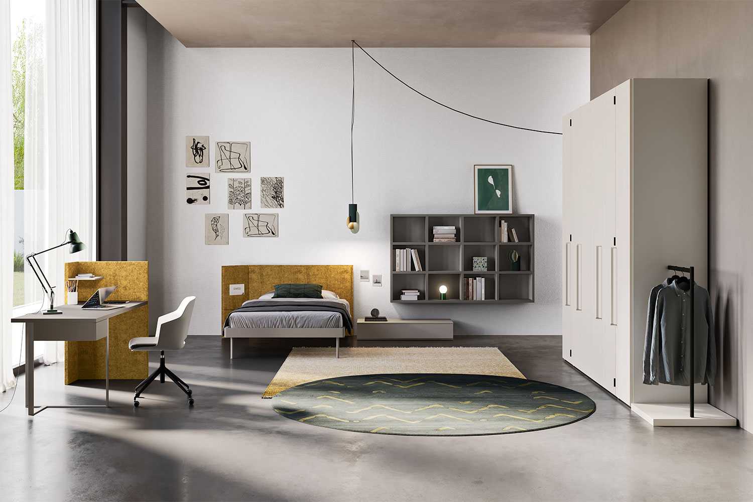 Start T06 è una cameretta studio con libreria sospesa e scrivania a centro stanza, cabina armadio con ante a pacchetto e cassetto-comodino basso, pensata per allestire la stanza di una ragazza, un ragazzo o giovani adulti. Presentata in una gamma di colori neutri e unisex come grigio chiaro, antracite e ocra, è personalizzabile per finiture, materiali, dimensioni e disposizione dei singoli elementi per realizzare soluzioni d’arredo uniche.
