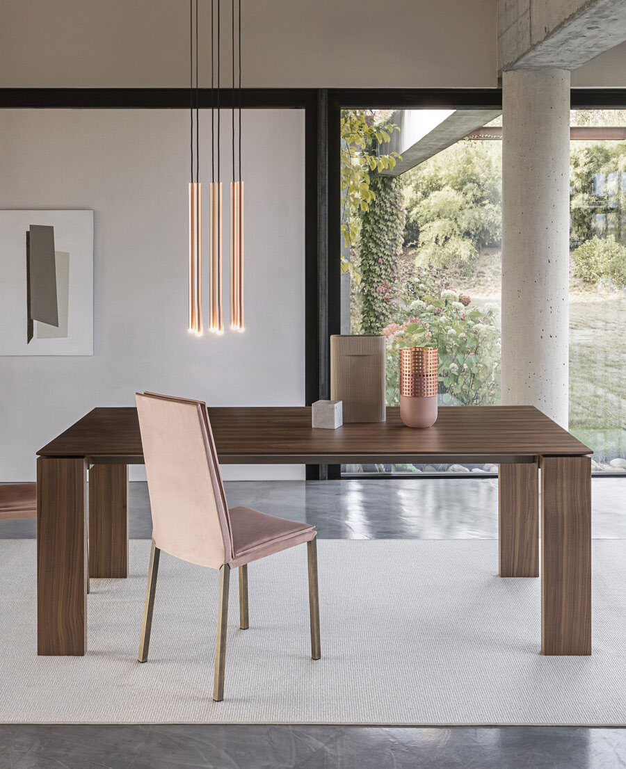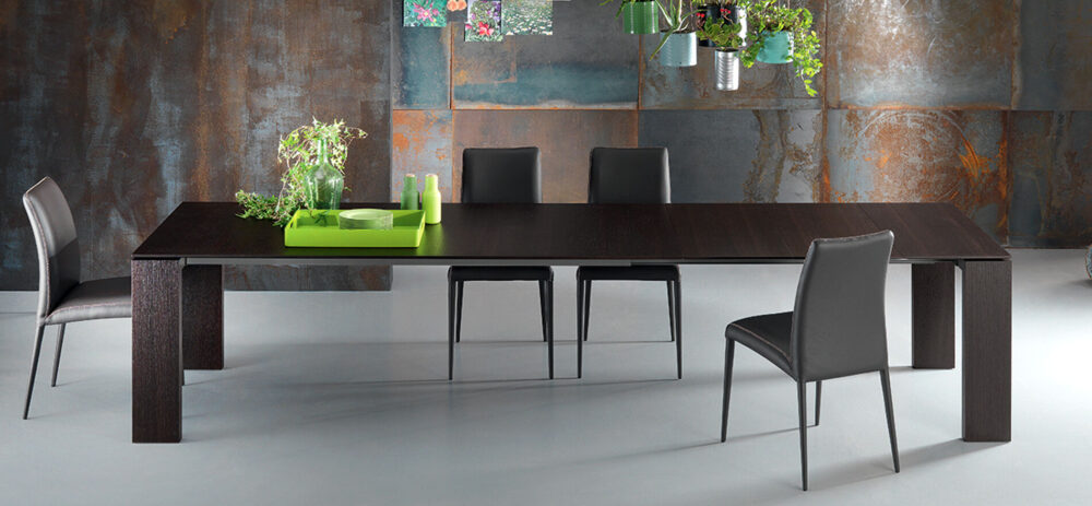 Il tavolo Atlante è interamente in legno, disponibile nelle finiture noce canaletto e rovere coke termo-trattato. Le gambe a cavalletto della larghezza di 17 cm gli conferiscono un aspetto maestoso. La bisellatura del piano mette in risalto le calde venature del legno. Il tavolo è dotato di un sistema di allunghe con guide in alluminio anodizzato. Allunghe interne in biglia con il piano.