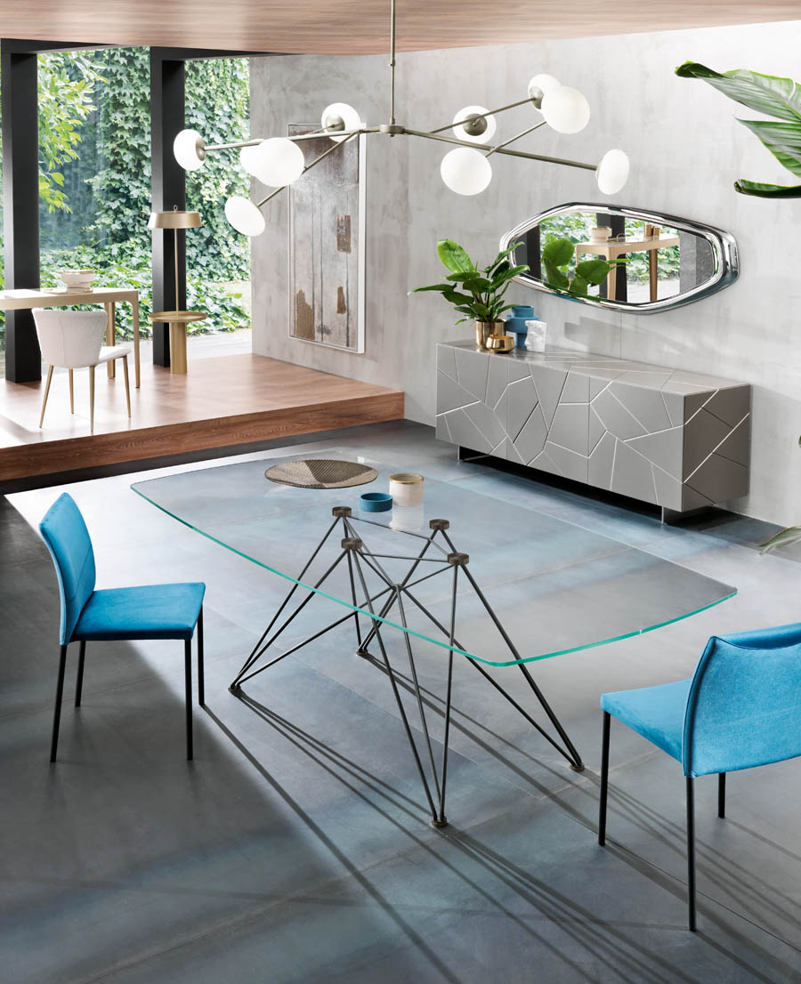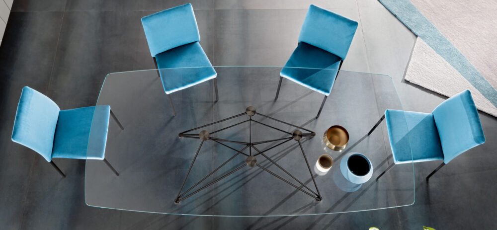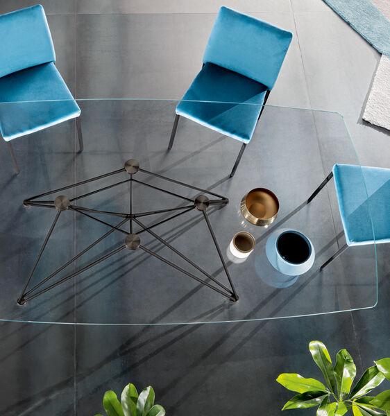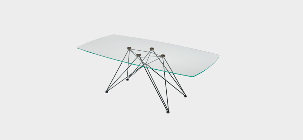 La base, costituita da linee sottili, quasi impercettibili, è realizzata in tondino di metallo verniciato nelle finiture a campionario e abbinata a piani in cristallo dello spessore di 12 mm, con speciale incollaggio cristallo/acciaio per le piastre di supporto. Il risultato è un tavolo dal design elegante e contemporaneo. Disponibile solo fisso. Forme: rotondo, ovale, a botte o rettangolare con angoli arrotondati (raggio 5 mm).